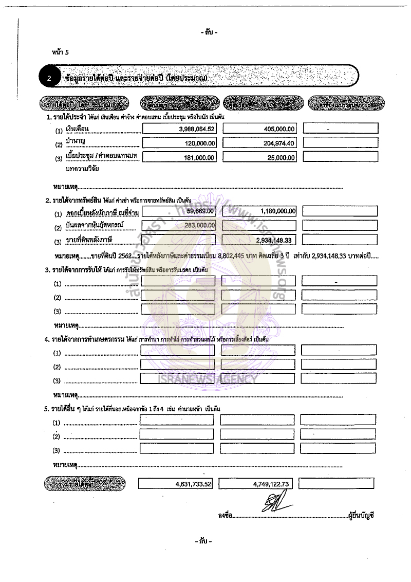 คู่สมรส แจ้งมีรายได้ต่อปี 4,749,122.73 บาท จาก เงินเดือน 405,000 บาท บำนาญ 204,974.40 บาท เบี้ยประชุม ค่าตอบแทนบทความวิจัย 25,000 บาท ดอกเบี้ยหลักภาษี ณ ที่จ่าย 1,180,000 บาท ขายที่ดินหลังหักภาษี 2,934,148.33 บาท