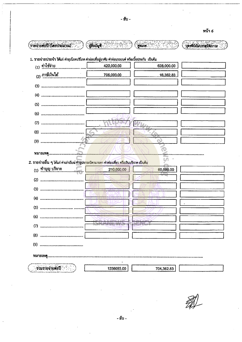 แจ้งมีรายจ่าย 704,362.83 บาท จากค่าใช้จ่าย 628,000 บาท ภาษีเงินได้ 16,362.83 บาท ทำบุญ บริจาค 60,000 บาท