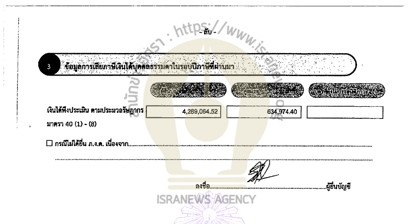 นายสุวิทย์ แจ้งเสียภาษีเงินได้บุคคลธรรมดาในรอบปีภาษีที่ผ่านมา ระบุ เงินได้พึงประเมิน ตามประมวลรัษฎากร มาตรา 40 (1) – (8) จำนวน 4,289,064.52 บาท คู่สมรส 634,974.40 บาท