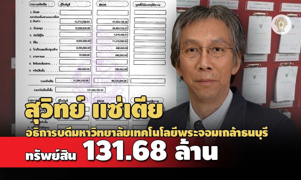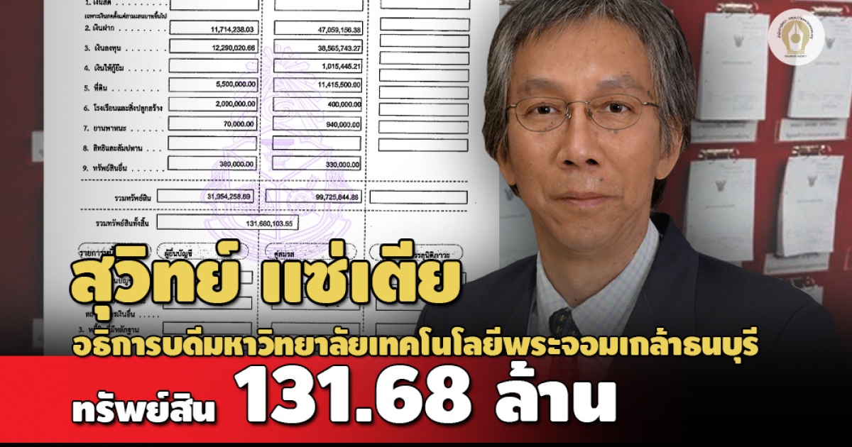 ทรัพย์สิน 131.68 ล้านบาท 'สุวิทย์ แซ่เตีย' อธิการบดี มจธ.-คู่สมรส เงินฝาก 49 บัญชี 58.77 ล้านบาท เงินลงทุน 53 รายการ 50 ล้านบาท