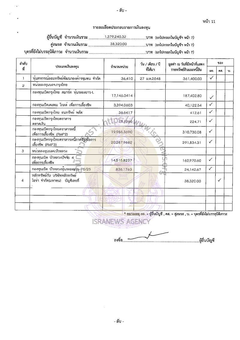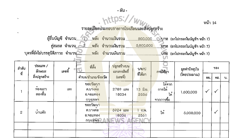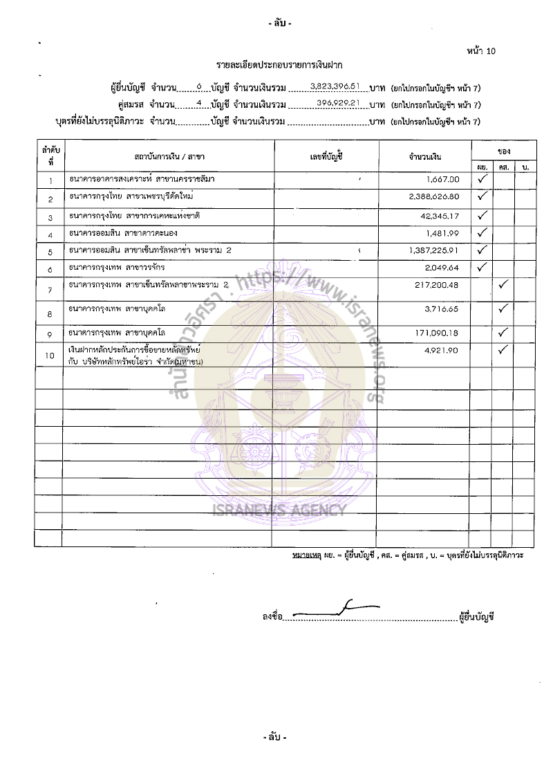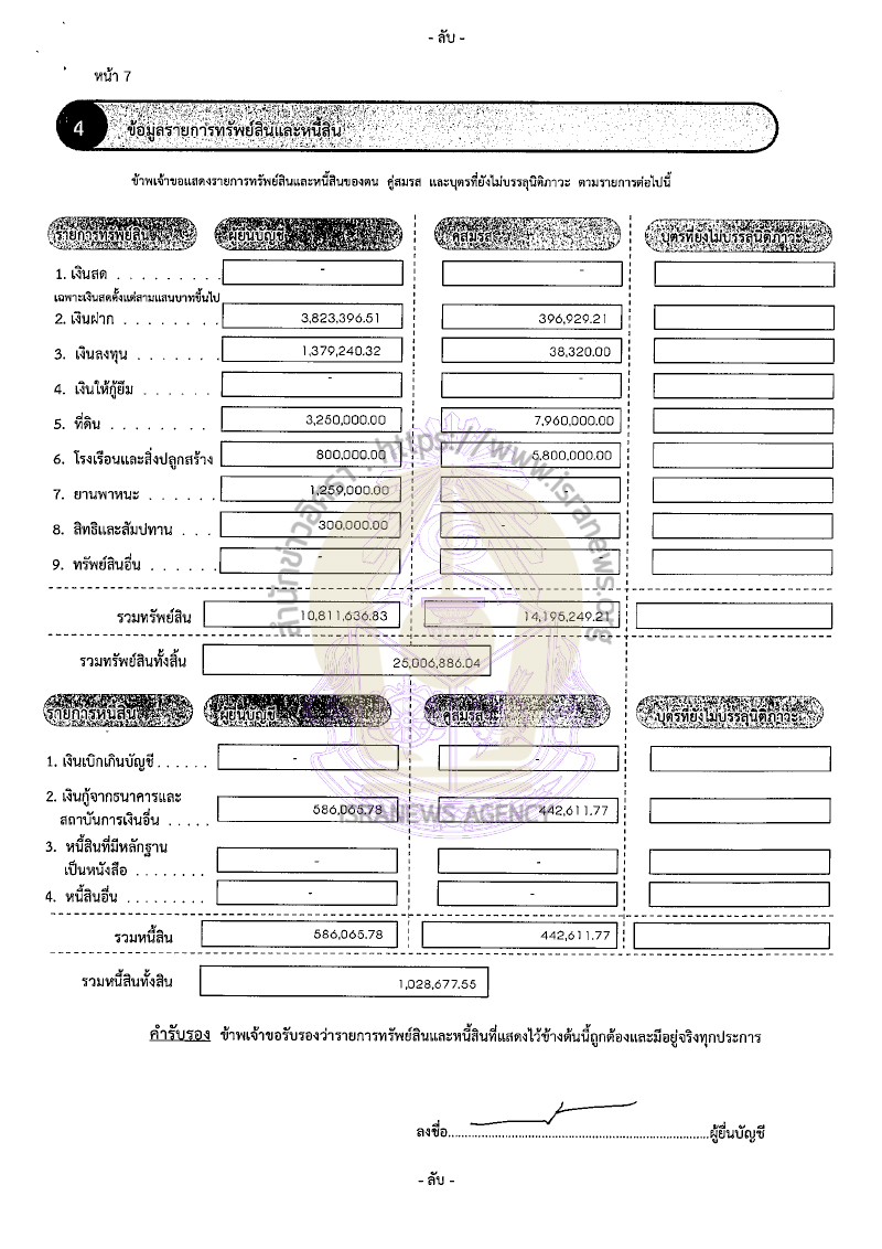 รวมทรัพย์สินทั้งสิ้น 25,006,886.04 บาท (เงินฝาก 10 บัญชี 4,220,325.72 บาท บ้าน-ที่ดิน 17,810,000 บาท) หนี้สิน 1,028,677.55 บาท
