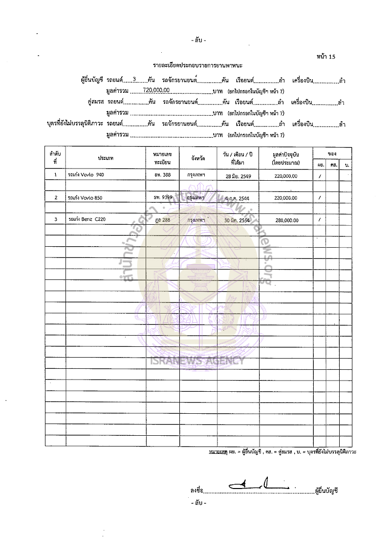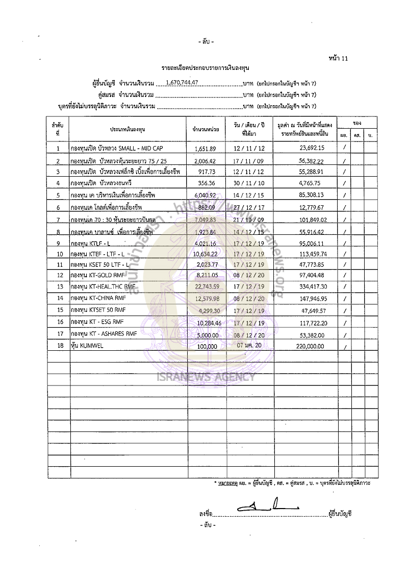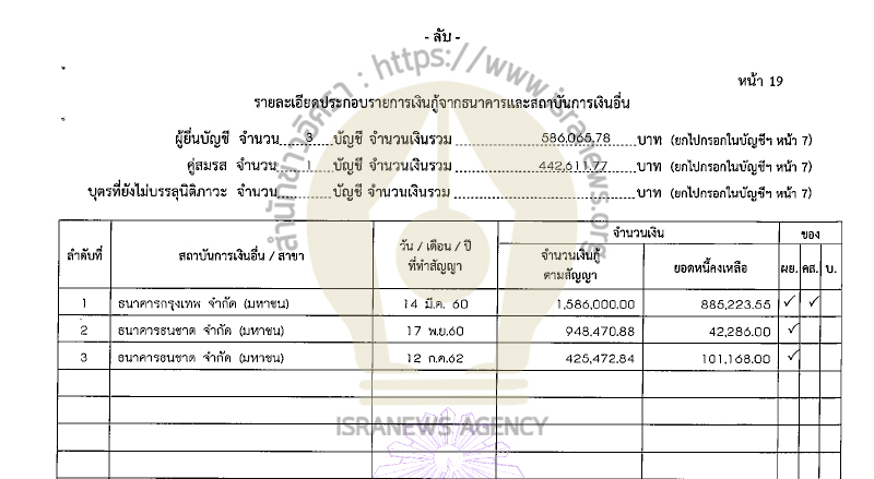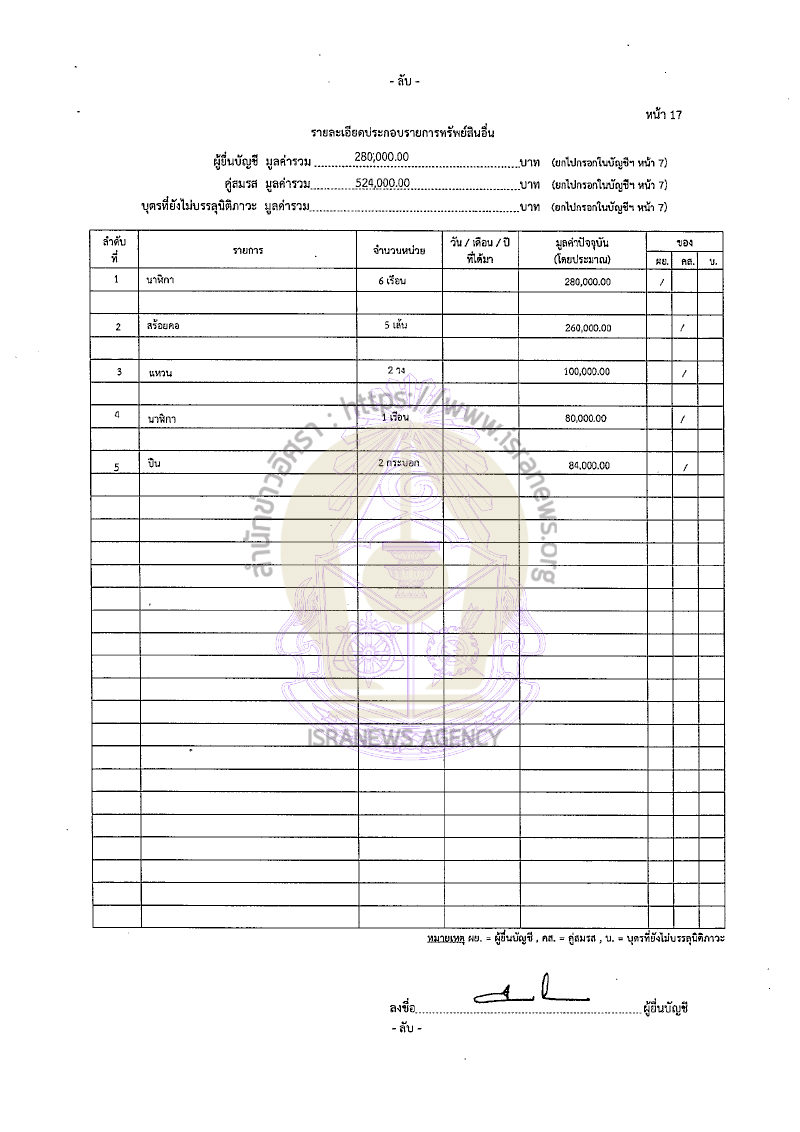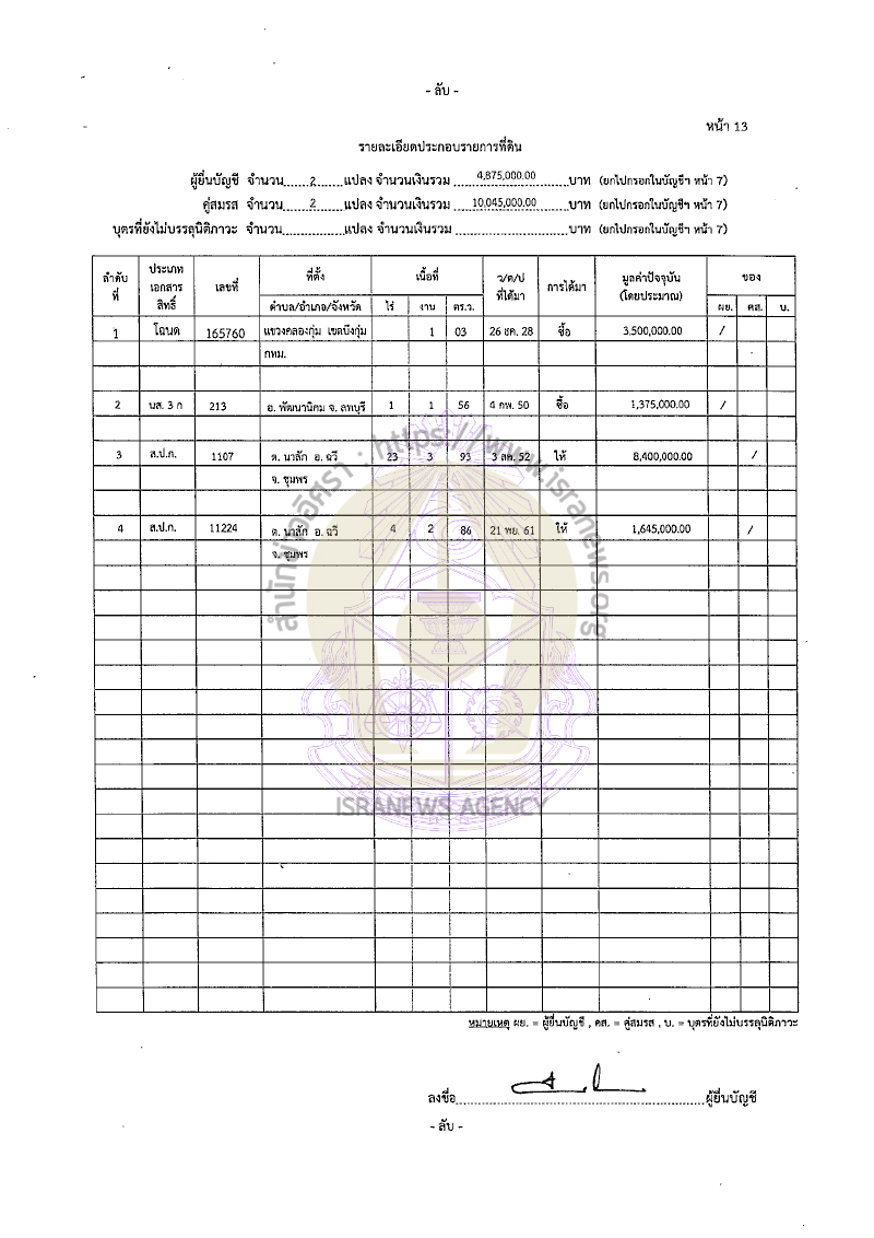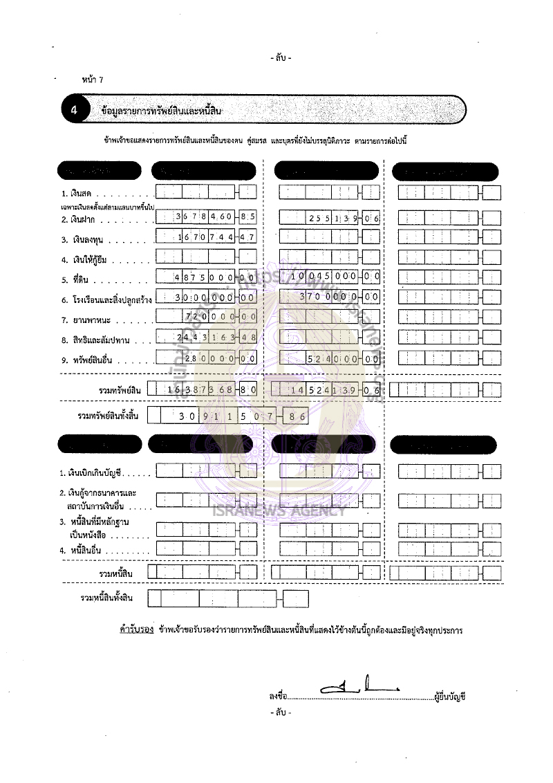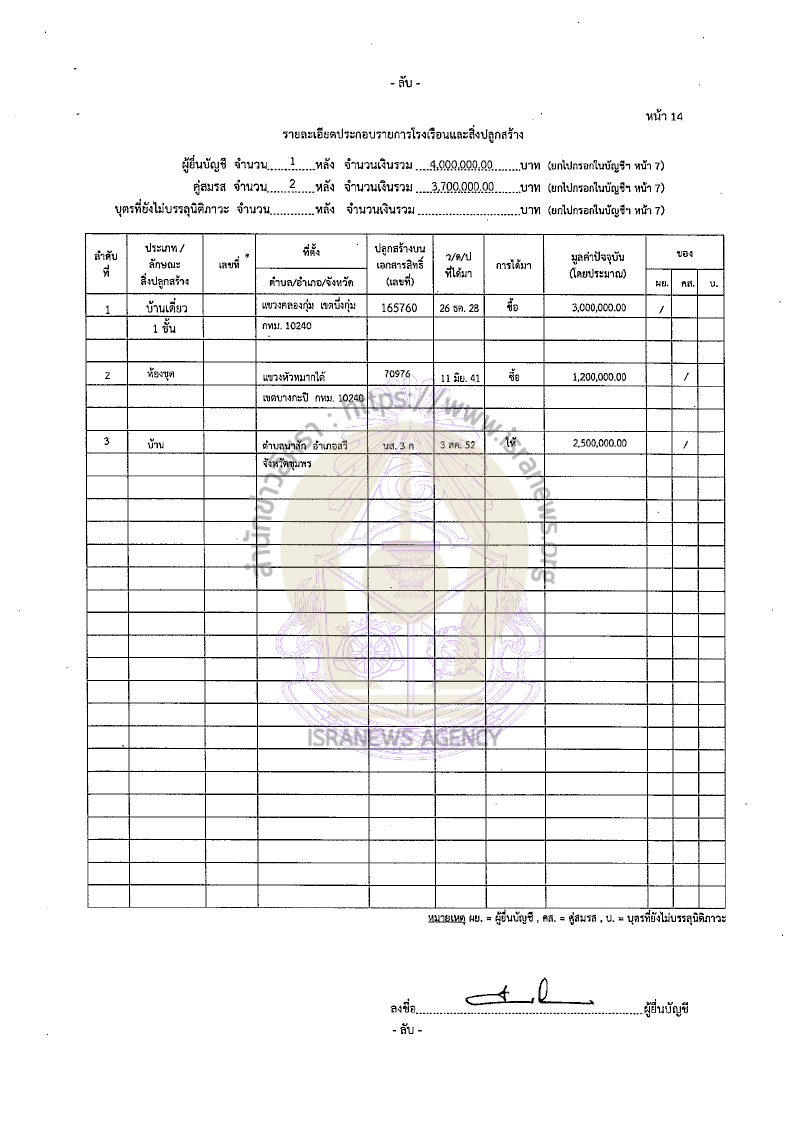 รวมทรัพย์สินทั้งสิ้น 30,911,507.86 บาท (ที่ดิน 4 แปลง 14,920,000 บาท บ้าน-คอนโด 3 หลัง 6,700,000 บาท) ไม่มีหนี้สิน