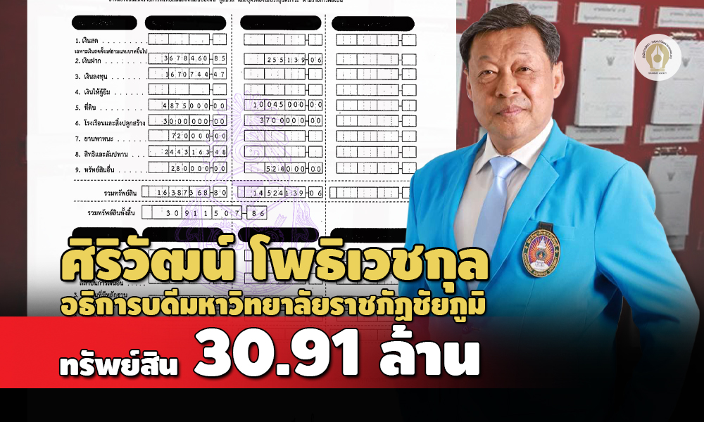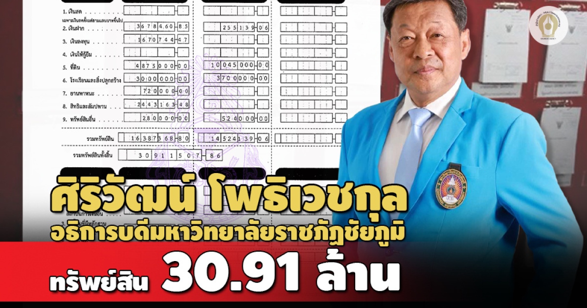 ทรัพย์สิน 30.91 ล้านบาท 'ศิริวัฒน์ โพธิเวชกุล' อธิการ มรภ.ชัยภูมิ ที่ดิน 4 แปลง 14.92 ล้านบาท บ้าน-คอนโด 3 หลัง 6.7 ล้านบาท รายได้ต่อปี 5.89 ล้านบาท จากเงินเดือน เงินประจำตำแหน่ง บำนาญ และงานบริการวิชาการ