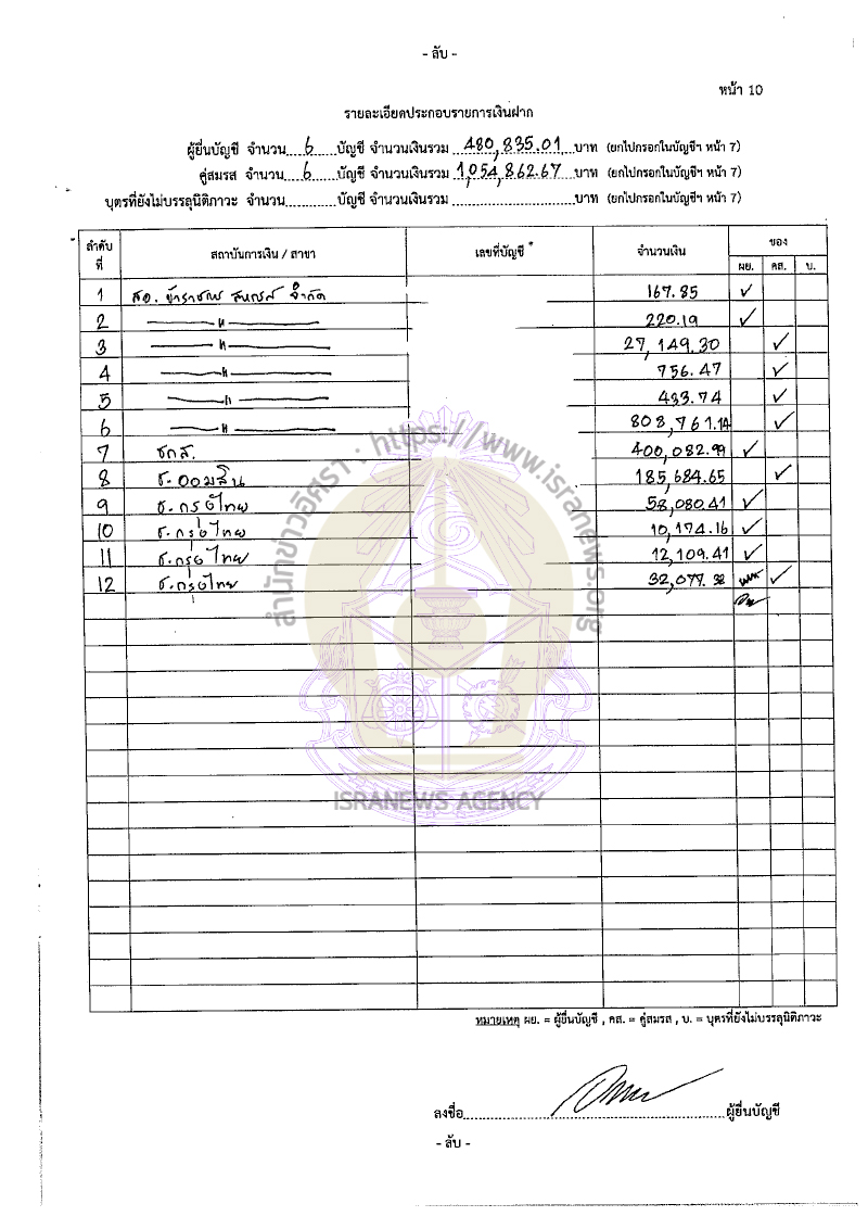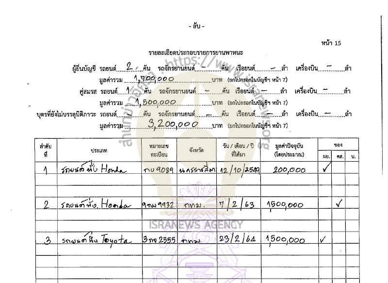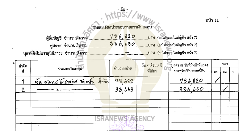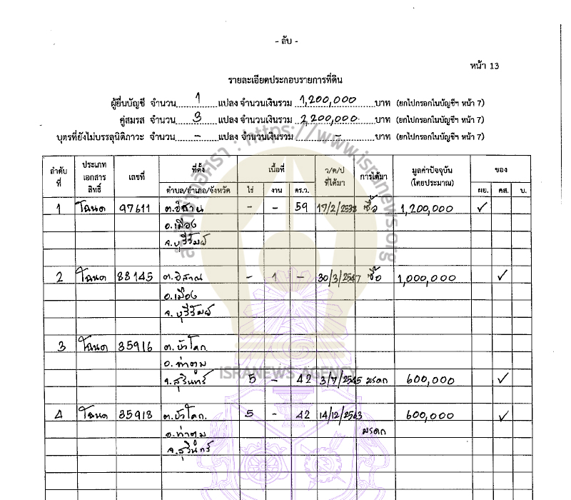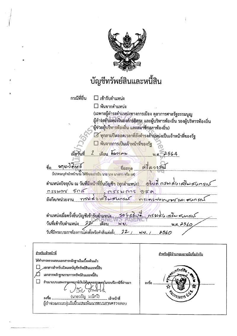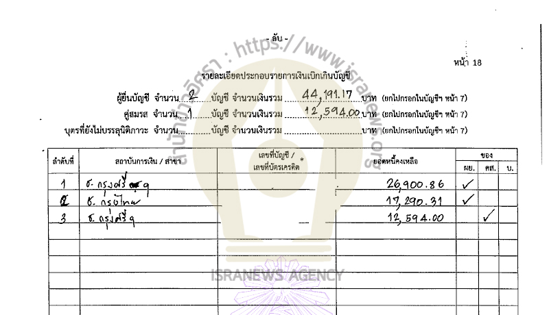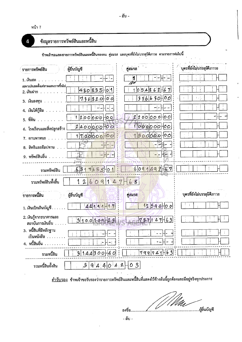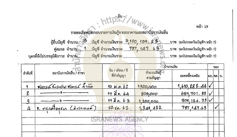 แจ้งมีหนี้สิน 3,144,300.40 บาท จากเงินเบิกเกินบัญชี 44,191.17 บาท เงินกู้ธนาคาร 3,100,109.23 บาท