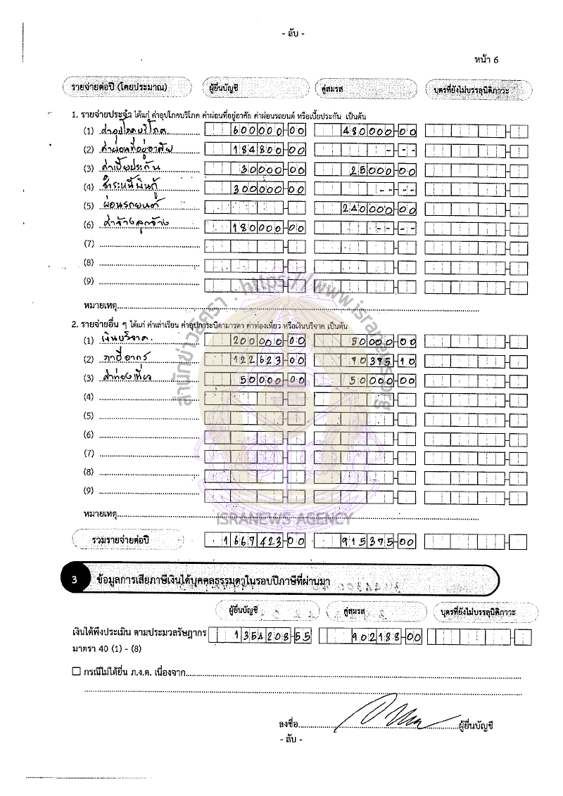 แจ้งมีรายจ่าย 915,375 บาท จากค่าอุปโภคบริโภค 480,000 บาท เบี้ยประกัน 25,000 บาท ผ่อนรถยนต์ 240,000 บาท เงินบริจาค 50,000 บาท ภาษีอากร 70,375.10 บาท ค่าท่องเที่ยว 50,000 บาท