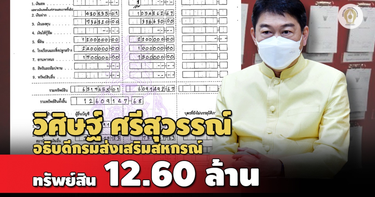 ทรัพย์สิน 12.60 ล้านบาท 'วิศิษฐ์ ศรีสุวรรณ์'อธิบดีกรมส่งเสริมสหกรณ์ เงินฝาก 12 บัญชี 1.53 ล้านบาท ที่ดิน 4 แปลง 3.4 ล้านบาท รายได้ต่อปี 1.56 ล้านบาทจากเงินเดือน-เบี้ยประชุม