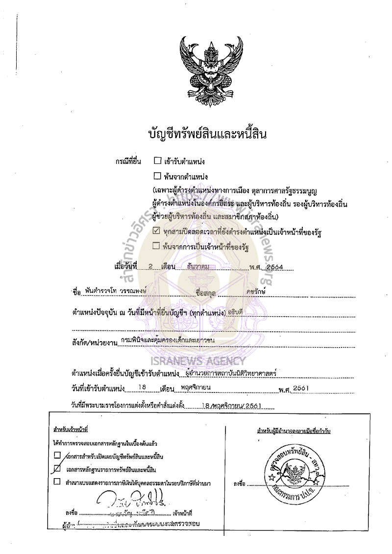 ผู้สื่อข่าวรายงานว่า เมื่อวันที่ 29 มี.ค.2565 สำนักงานคณะกรรมการป้องกันและปราบปรามการทุจริตแห่งชาติ (ป.ป.ช.) เปิดเผยบัญชีทรัพย์สินและหนี้สินและเอกสารประกอบของผู้ดำรงตำแหน่งระดับสูง รายของ พ.ต.ท.วรรณพงษ์ คชรักษ์ อธิบดีกรมพินิจและคุ้มครองเด็กและเยาวชน กรณีทุก 3 ปีตลอดเวลาที่ยังดำรงตำแหน่งเป็นเจ้าหน้าที่รัฐ เมื่อวันที่ 2 ธ.ค.2564