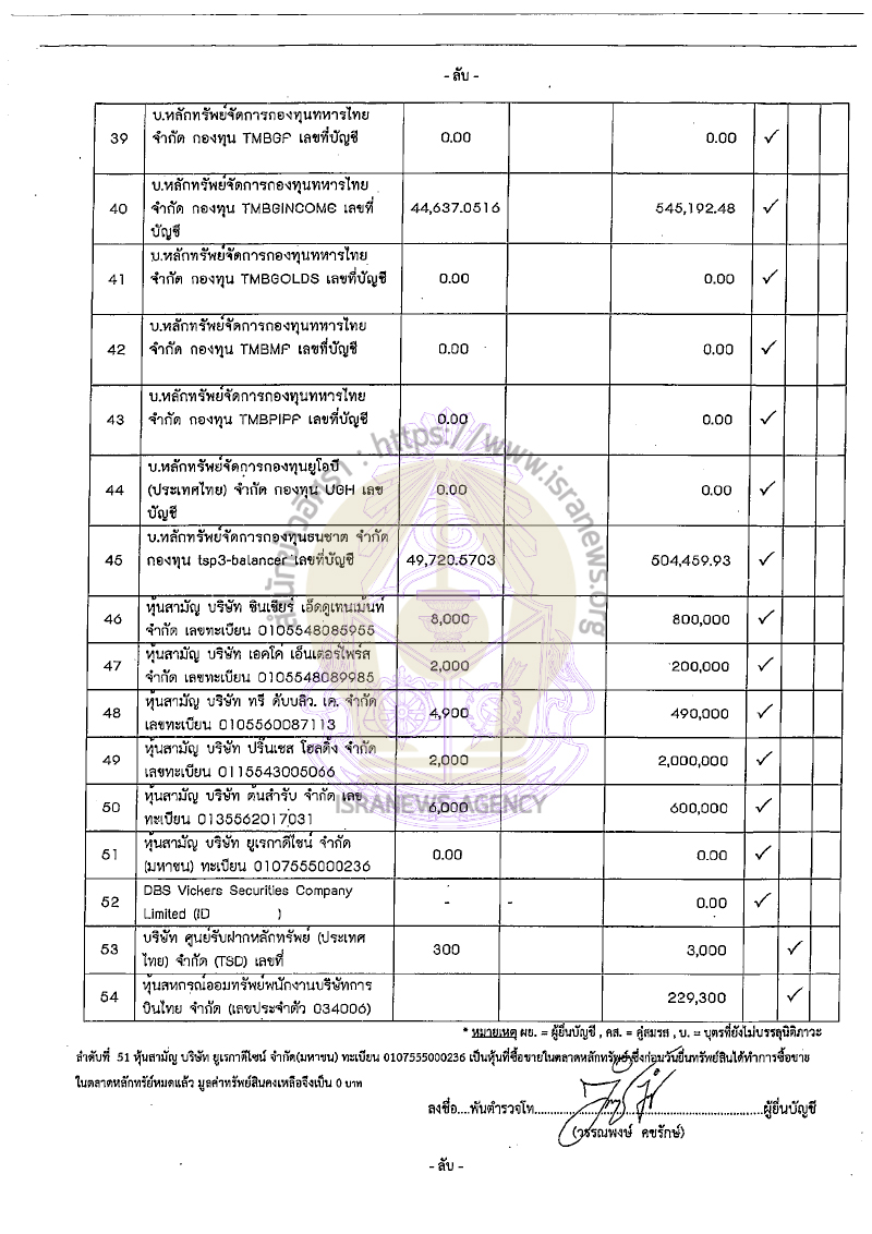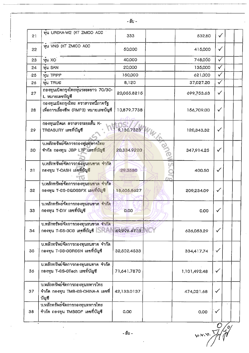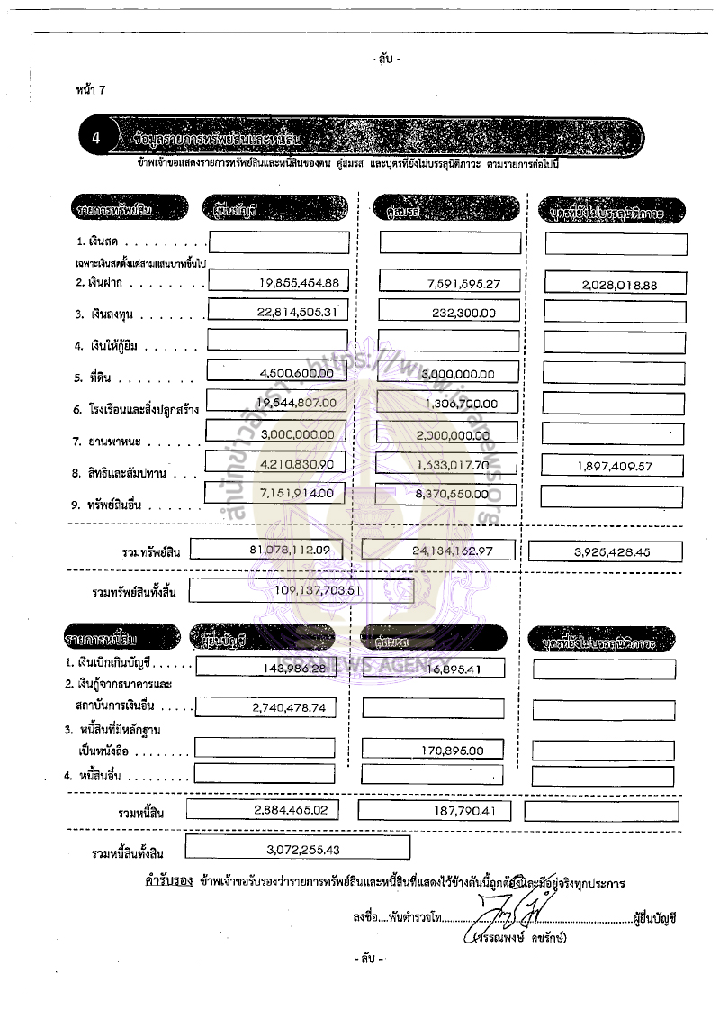 รวมทรัพย์สินทั้งสิ้น 109,137,703.51 บาท (เงินฝาก 40 บัญชี 29,475,069.03 บาท เงินลงทุน 54 รายการ 23,046,805.31 บาท ที่ดิน 11 แปลง ห้องชุด 2 ห้อง บ้าน 3 หลัง รวม 28,352,107 บาท) หนี้สิน 3,072,255.43 บาท