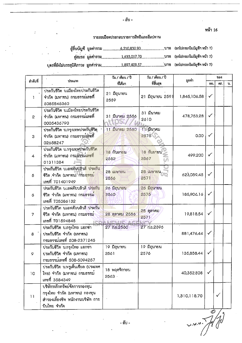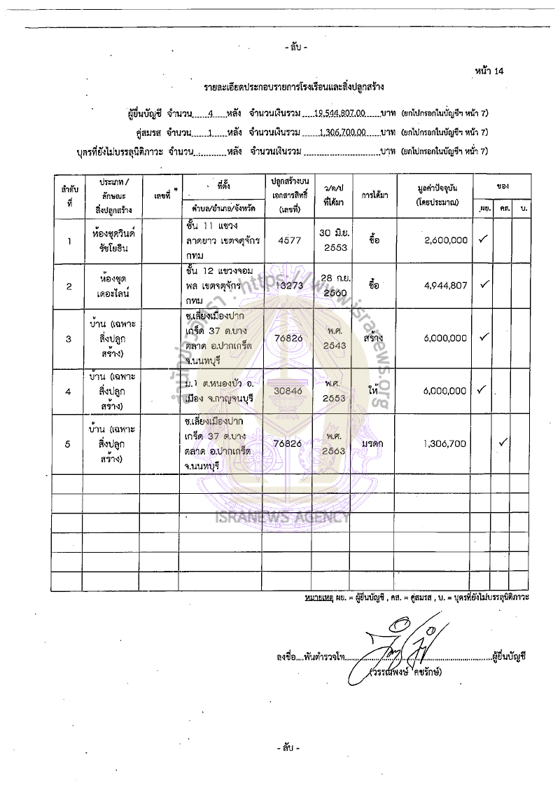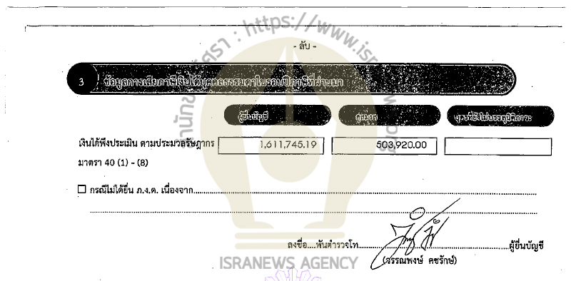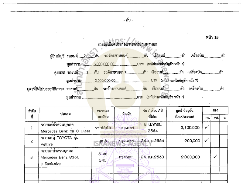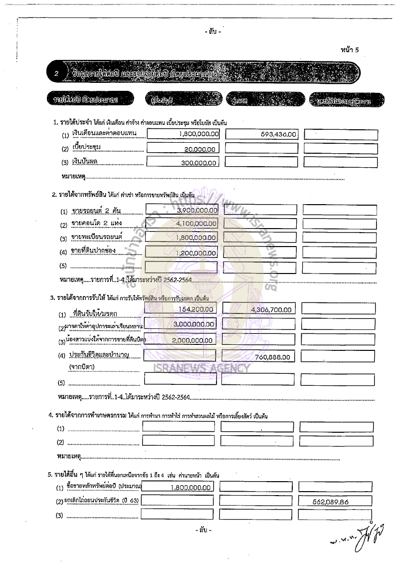 คู่สมรส แจ้งมีรายได้ต่อปี 5,5661,024 บาท จากเงินเดือนและค่าตอบแทน 593,436 บาท ที่ดินรับให้/มรดก 4,306,700 บาท ประกันชีวิตและบำนาญจากบิดา 760,888 บาท