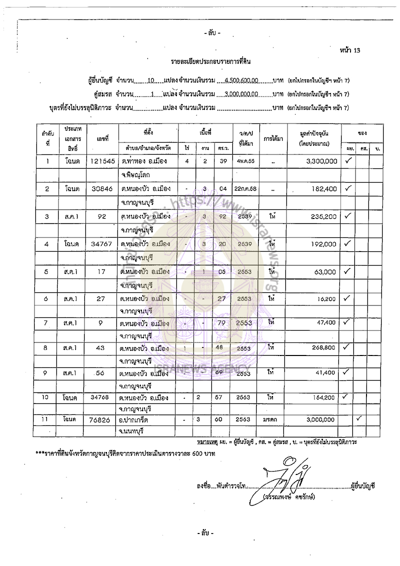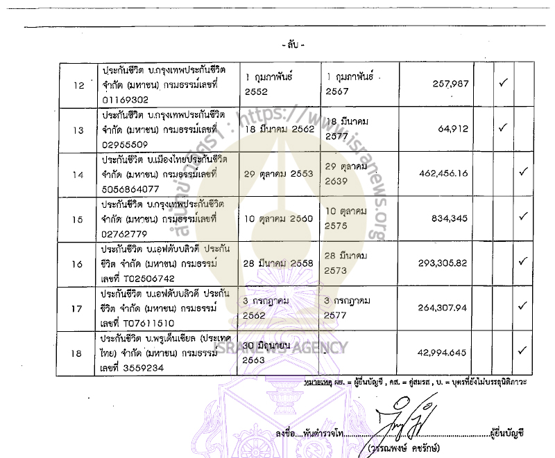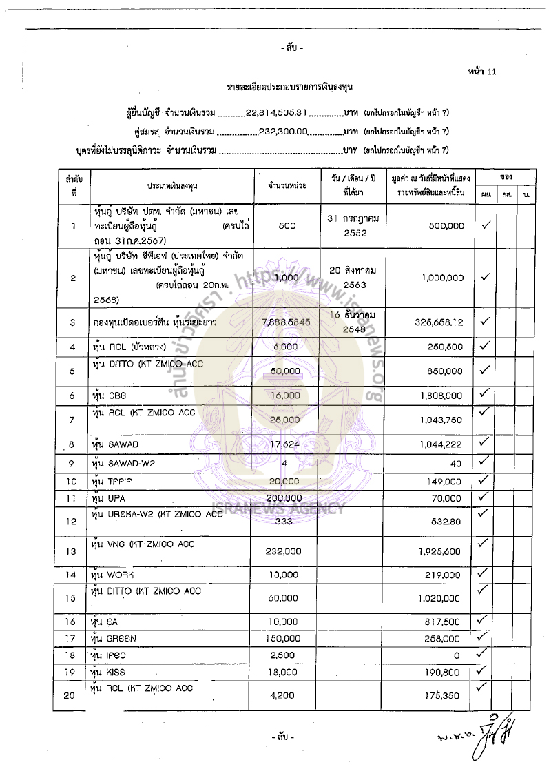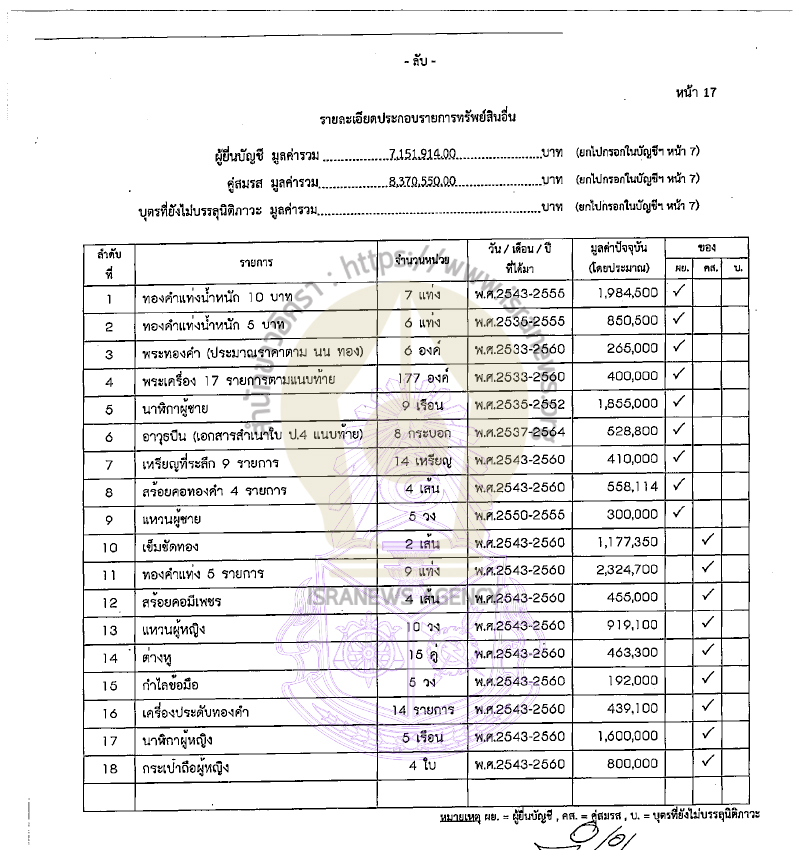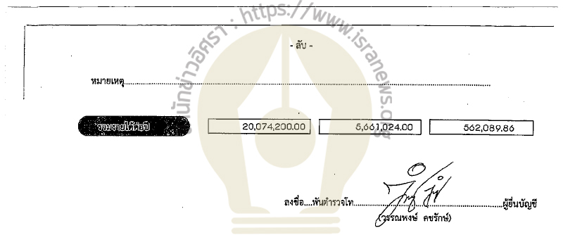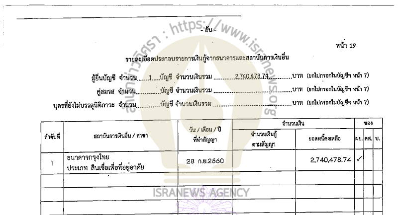 คู่สมรส แจ้งมีรายได้ต่อปี 5,5661,024 บาท จากเงินเดือนและค่าตอบแทน 593,436 บาท ที่ดินรับให้/มรดก 4,306,700 บาท ประกันชีวิตและบำนาญจากบิดา 760,888 บาท