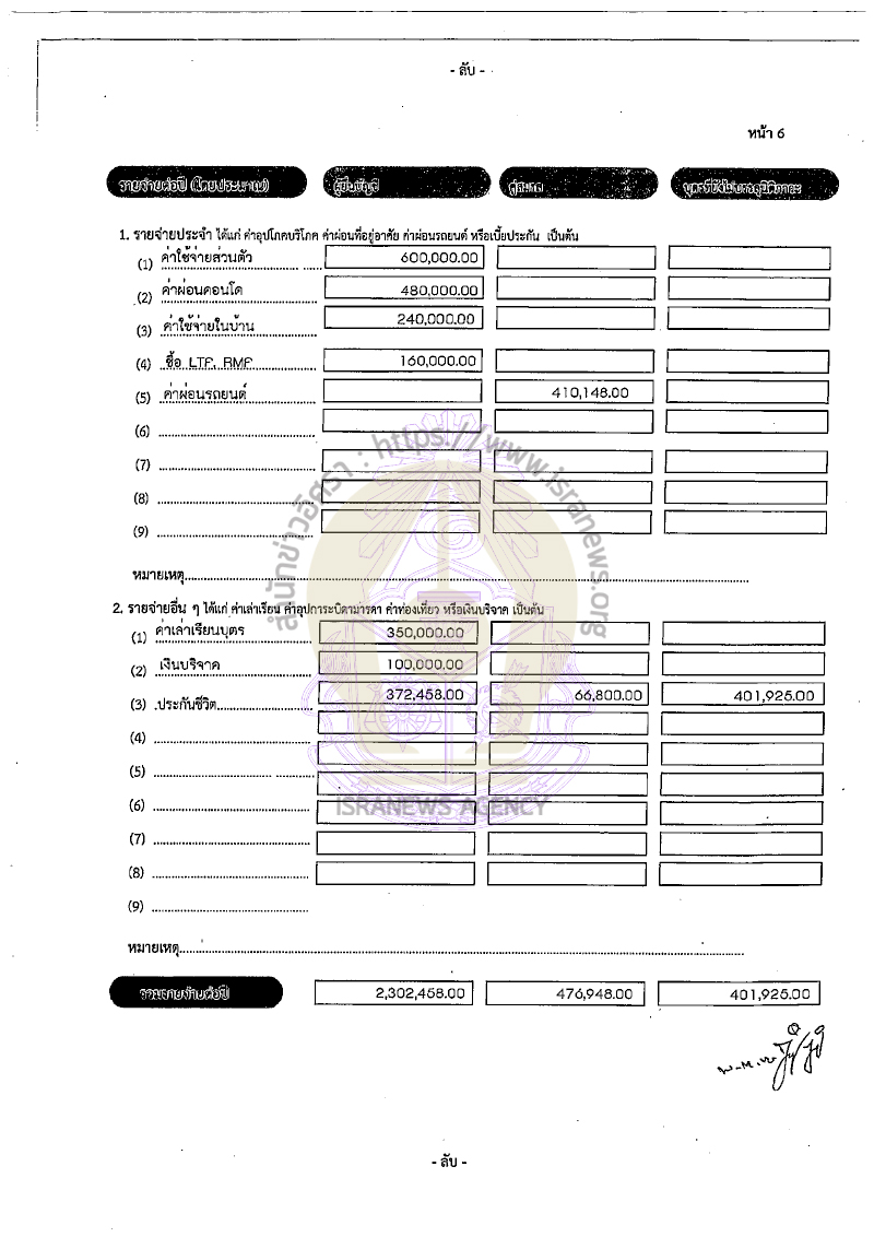 แจ้งมีรายจ่าย 476,948 บาท จากค่าผ่อนรถยนต์ 410,148 บาท ประกันชีวิต 66,800 บาท