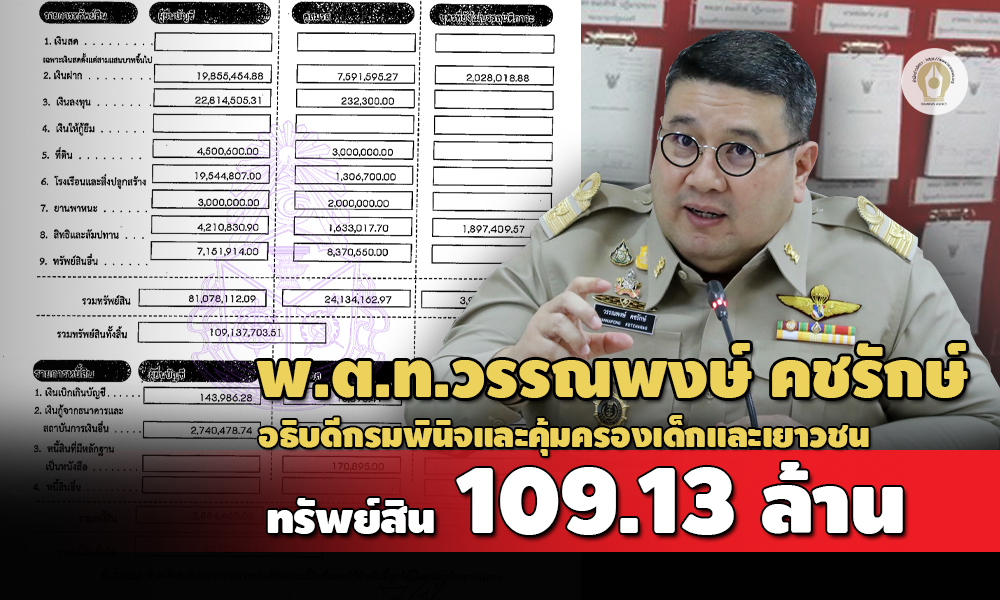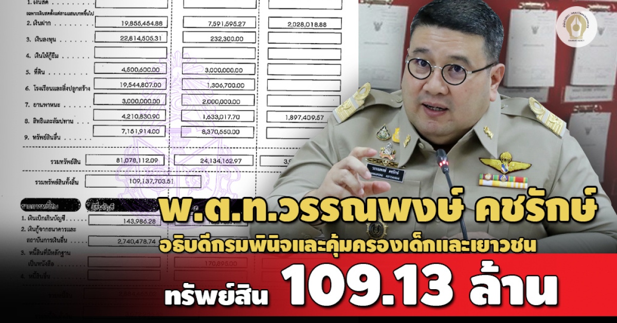 ทรัพย์สิน 109.13 ล้านบาท อธิบดีกรมพินิจและคุ้มครองเด็กและเยาวชน 'พ.ต.ท.วรรณพงษ์ คชรักษ์' เงินฝาก 40 บัญชี 29.47 ล้านบาท ลงทุนหุ้น 54 รายการ 23.04 ล้านบาท ที่ดิน-บ้าน 28.35 ล้านบาท รายได้ 20 ล้านบาท จากการขายรถ คอนโด ที่ดิน - แม่ให้ค่าเล่าเรียนหลาน