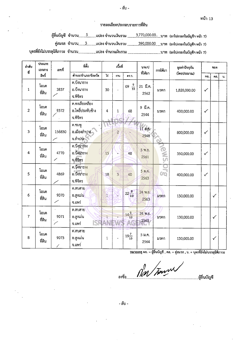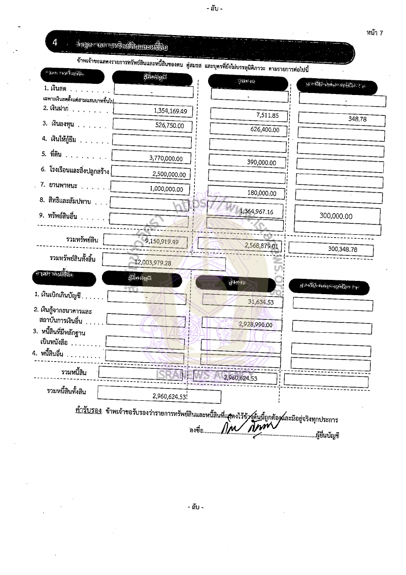 รวมทรัพย์สินทั้งสิ้น 12,003,979.28 บาท (ที่ดิน 8 แปลง เนื้อที่รวม 72 ไร่ที่พิจิตร-แพร่ 4,160,000 บาท) หนี้สิน 2,960,624.53 บาท