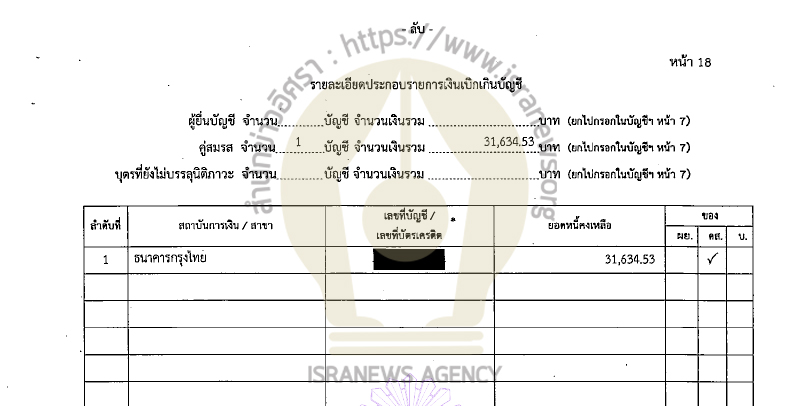 แจ้งมีรายจ่าย 629,276.60 บาท จากค่าใช้จ่ายส่วนตัว 240,000 บาท ค่าเบี้ยประกัน 24,596.60 บาท ค่าอุปการะบิดา-มารดา 36,000 บาท สหกรณ์ออมทรัพย์ครูกรมสามัญ 328,680 บาท