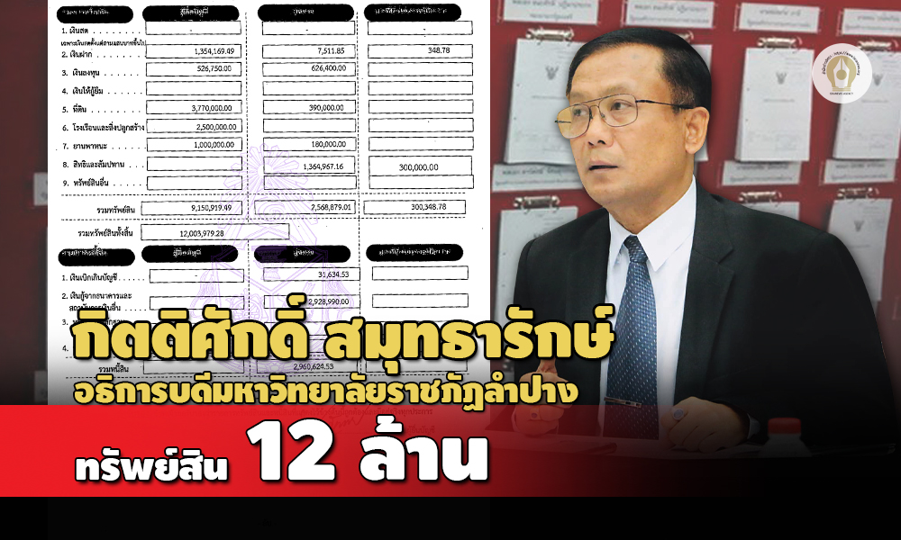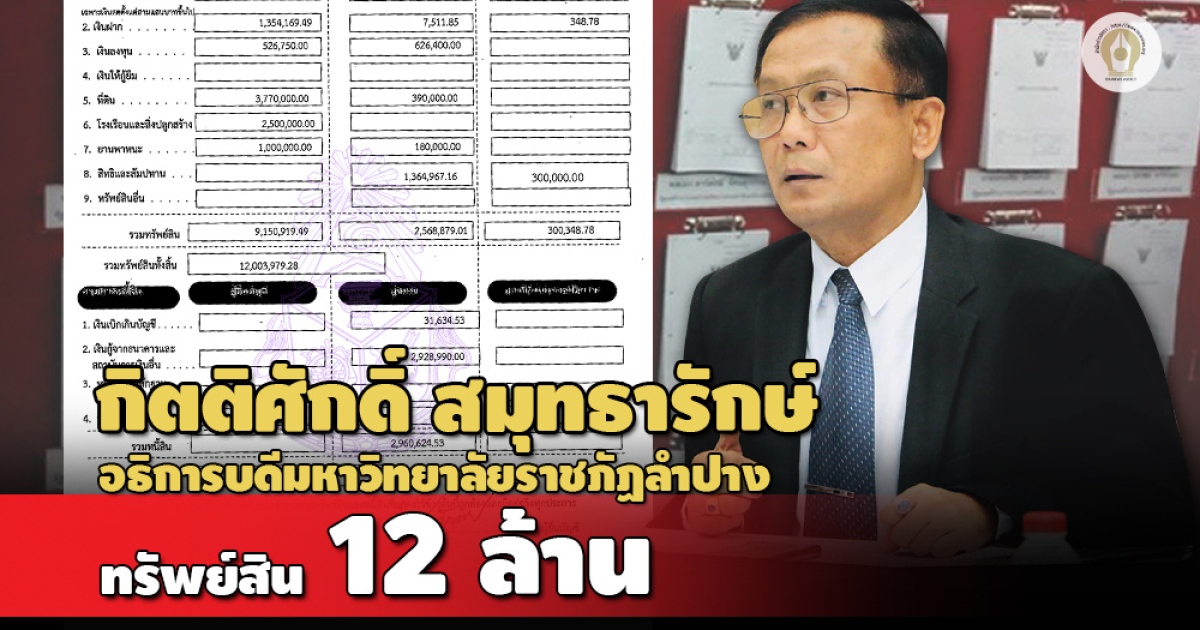 ทรัพย์สิน 12 ล้านบาท อธิการ มรภ.ลำปาง 'กิตติศักดิ์ สมุทธารักษ์' ที่ดิน 72 ไร่ใน จ.พิจิตร-แพร่ 4.16 ล้านบาท รายได้ต่อปี 1.89 ล้านบาทจากเงินเดือน เงินประจำตำแหน่ง