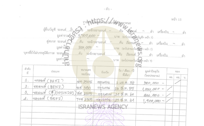รายการทรัพย์สินอื่นที่น่าสนใจ คู่สมรส แจ้งมี นาฬิกา 2 เรือน 500,000 บาท นาฬิกาฝังเพชร 1 เรือน 500,000 บาท ทองคำแท่ง 35 บาท 1,050,000 บาท แหวนหยก แหวนเพชร กำไลเพชร สร้อยเพชร ชุดบุษราคัม