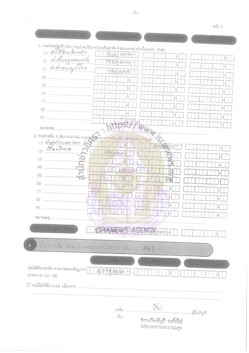 แจ้งมีรายจ่าย 1,300,000 บาท จากค่าใช้จ่ายส่วนตัว 360,000 บาท ค่าเลี้ยงดูครอบครัว 720,000 บาท ค่าสาธารณูปโภค 120,000 บาท เงินบริจาค 100,000 บาท
