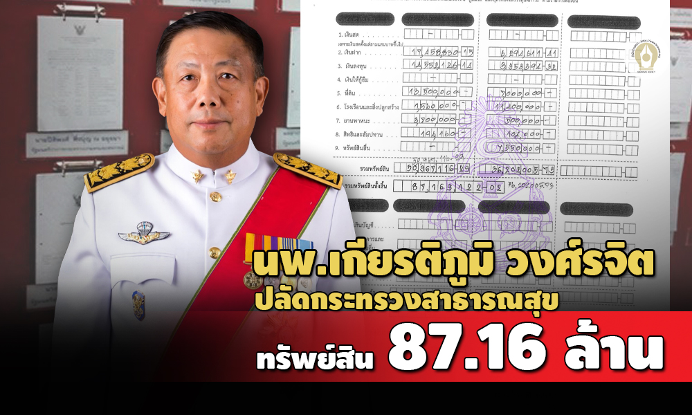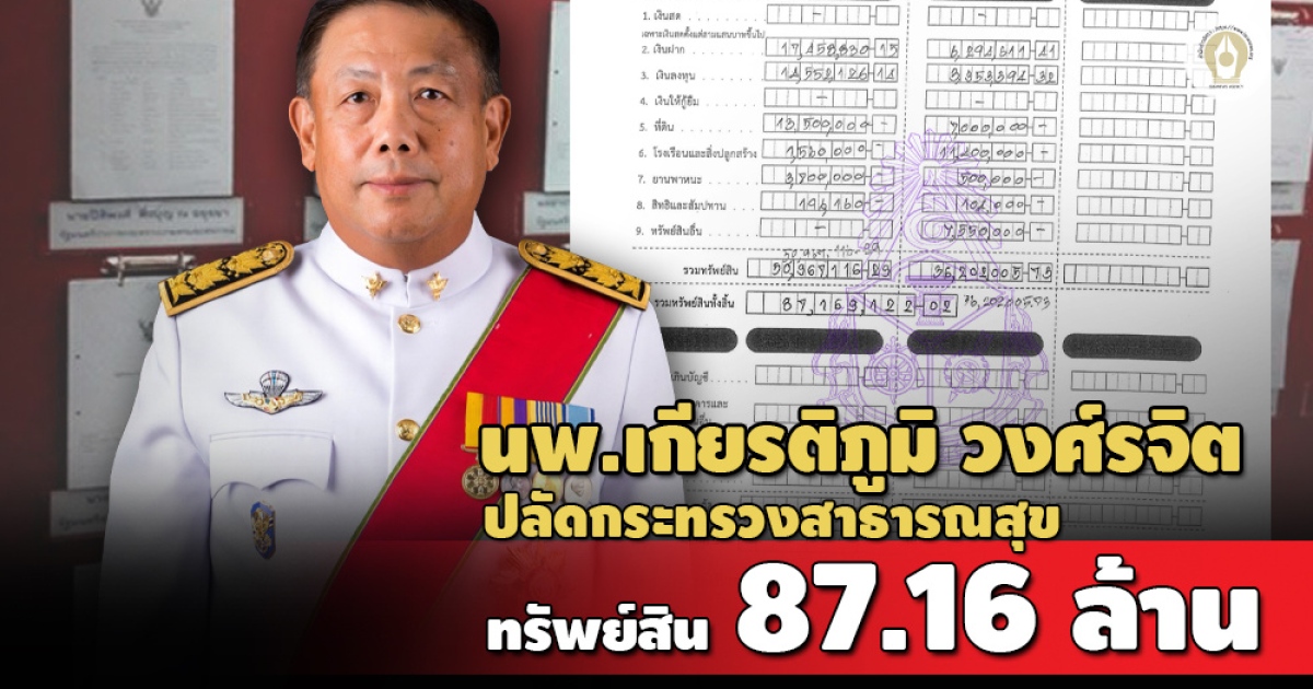 ทรัพย์สิน 87.16 ล้านบาท 'นพ.เกียรติภูมิ วงศ์รจิต' ปลัด สธ. เงินฝาก 21 บัญชี 23.75 ล้านบาท เงินลงทุน 17.90 ล้านบานท ที่ดิน 11 แปลง 20.50 ล้านบาท บ้าน ห้องชุด ตึกแถว 7 หลัง 12.96 ล้านบาท รายได้ 2.72 ล้านบาท จากเงินเดือน-เบี้ยประชุม