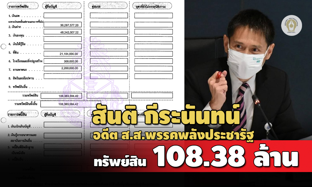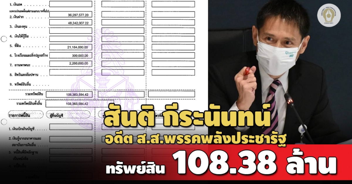 • ทรัพย์สิน 108 ล.'สันติ กีระนันทน์'อดีต ส.ส.พปชร.รายได้ 4.16 ล.จากดอกผลการลงทุน 2 ล.