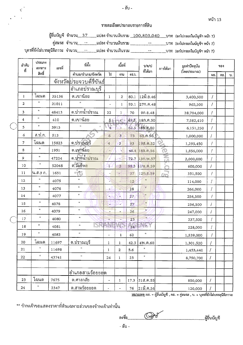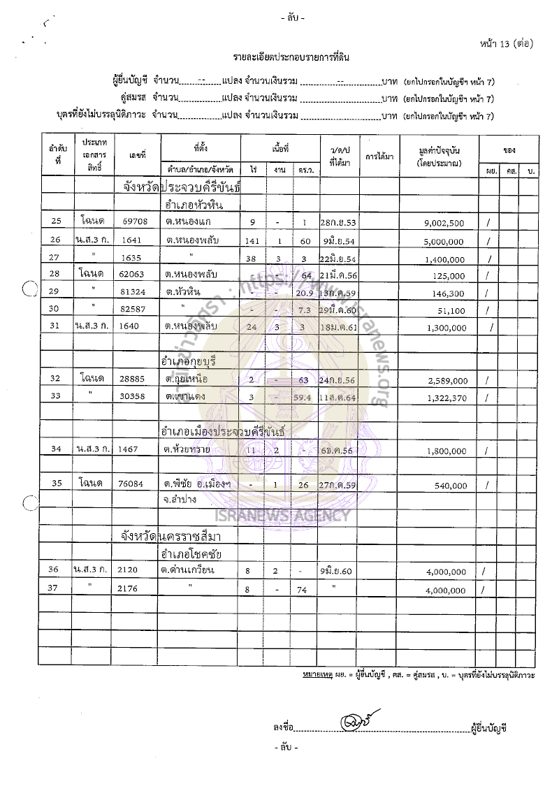 สำหรับรายละเอียดประกอบรายการที่ดิน นายจักรพันธ์ แจ้งถือครองที่ดิน 37 แปลง 100,803,040 บาท แบ่งเป็น ที่ดินใน จ.ประจวบคีรีขันธ์ 35 แปลง เป็น โฉนดที่ดิน 21 แปลง น.ส.3 ก. 13 แปลง และ ส.ป.ก. (เนื้อที่ 6-3-73 ไร่ ได้มาเมื่อ 6 ธ.ค.2550 มูลค่า 1,000,000 บาท) 1 แปลง นอกจากนี้ยังมีที่ดิน จ.นครราชสีมา 2 แปลงซึ่งเป็น น.ส.3 ก.