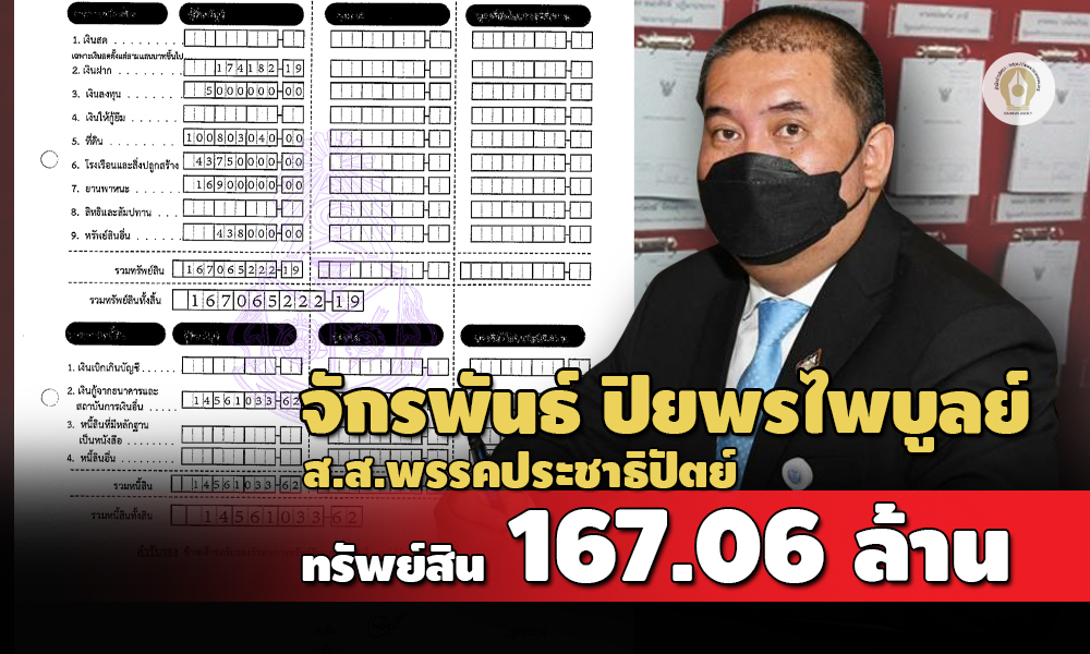 นายจักรพันธ์ ปิยพรไพบูลย์ อายุ 40 ปี แจ้งมีทรัพย์สิน 167,065,222.19 บาท จาก เงินฝาก (3 บัญชี) 174,182.19 บาท เงินลงทุน (ไก่ชน พร้อมอุปกรณ์การเลี้ยง 500 ตัว) 5,000,000 บาท ที่ดิน 100,803,040 บาท โรงเรือนและสิ่งปลูกสร้าง (11 หลัง) 43,750,000 บาท ยานพาหนะ (33 คัน แบ่งเป็น รถยนต์ 3 คัน รถโดยสารประจำทาง 30 คัน) 16,900,000 บาท ทรัพย์สินอื่น (ปืน 8 กระบอก) 438,000 บาท