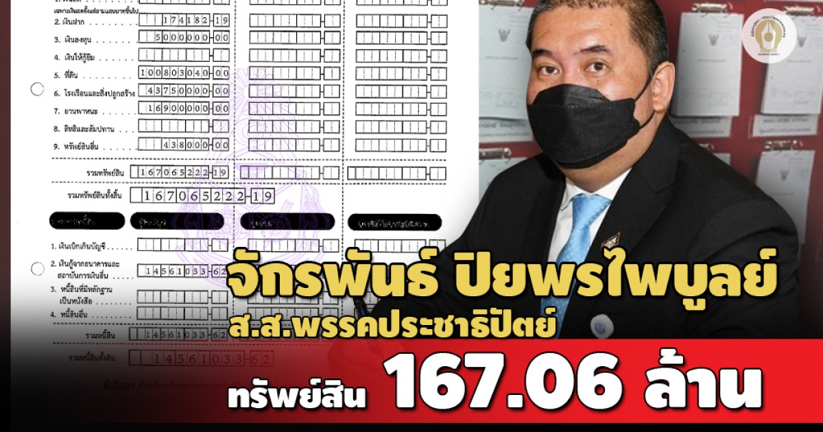 ทรัพย์สิน 167.06 ล้านบาท 'สจ.เซ้ม ไก่ชน' หรือ 'จักรพันธ์ ปิยพรไพบูลย์' นั่ง ส.ส.พรรคประชาธิปัตย์ แทน ‘อิสสระ สมชัย’ เลี้ยงไก่ชน 500 ตัว ที่ดิน 37 แปลง 100.80 ล้านบาท เป็น ส.ป.ก. 1 แปลง เนื้อที่ 6 ไร่ ได้มาตั้งแต่ 6 ธ.ค.50