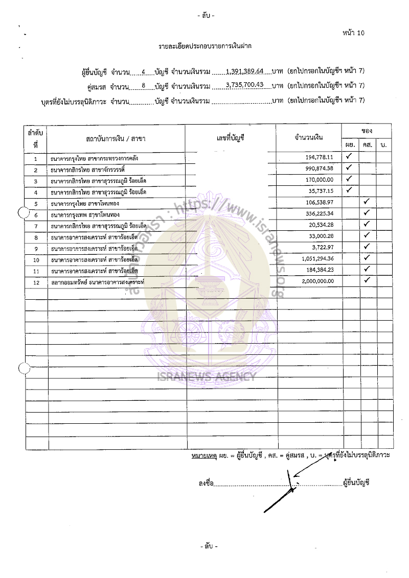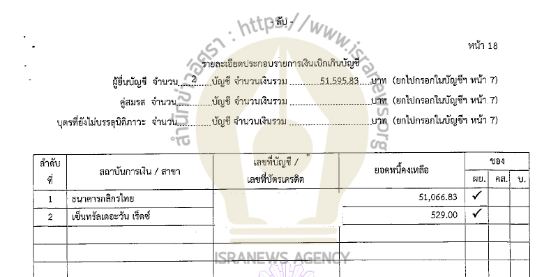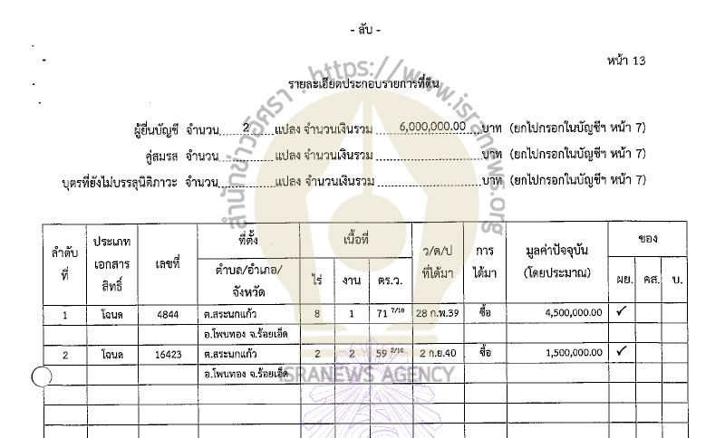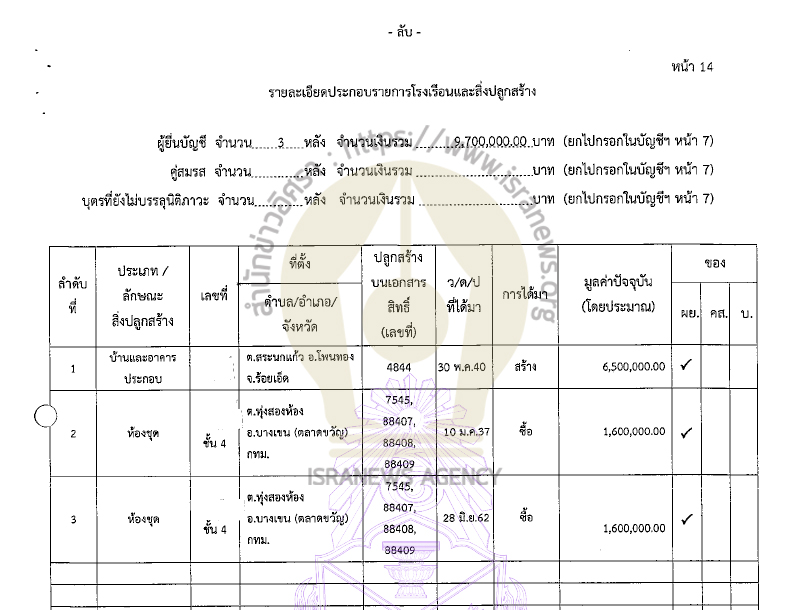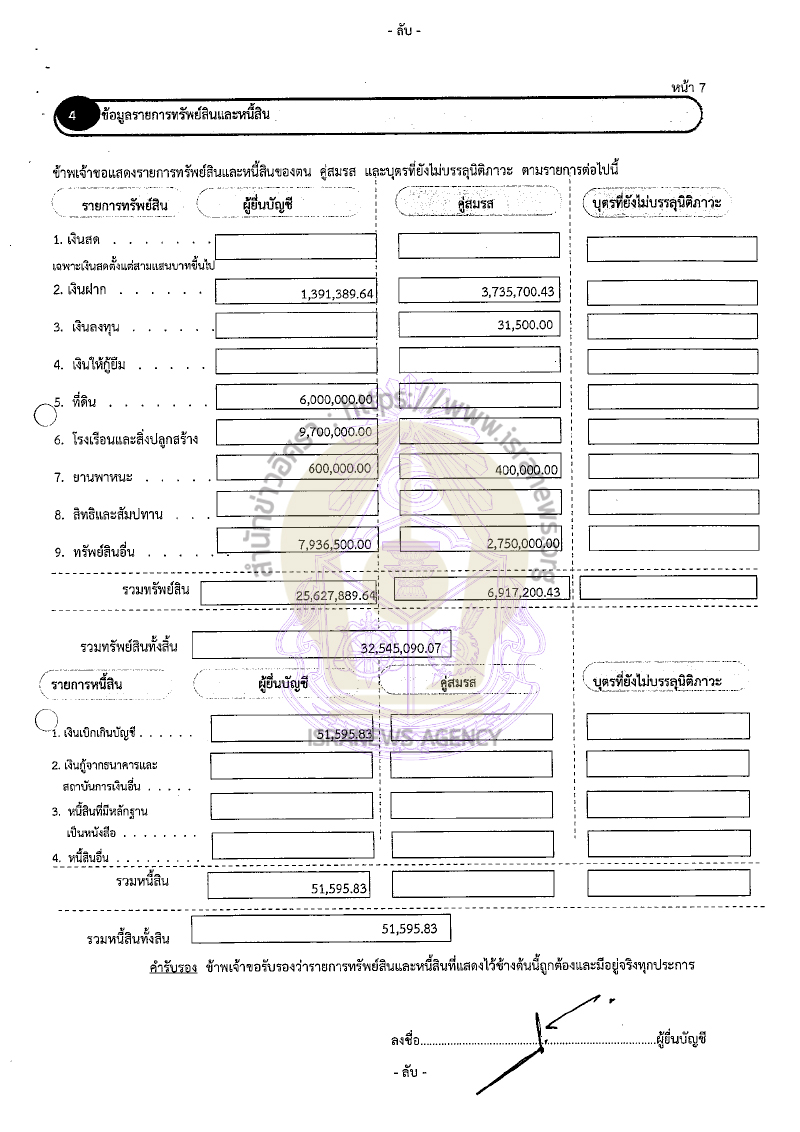 รวมทรัพย์สินทั้งสิ้น 32,545,090.07 บาท (เงินฝาก 12 บัญชี 5,127,090.07 บาท ที่ดิน 2 แปลง 6,000,000 บาท บ้านและอาคารประกอบ 1 หลัง ห้องชุด 2 ห้อง 9,700,000 บาท) หนี้สิน 51,595.83 บาท