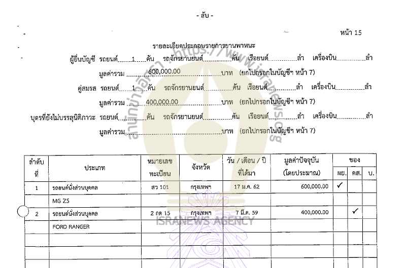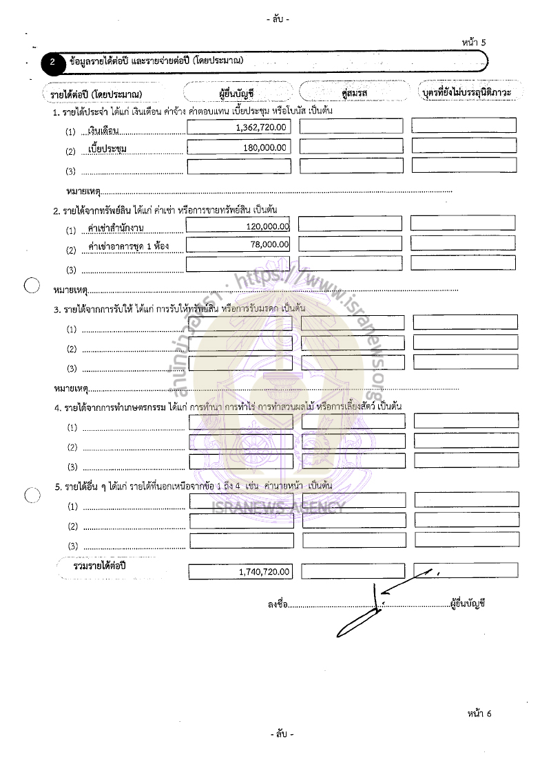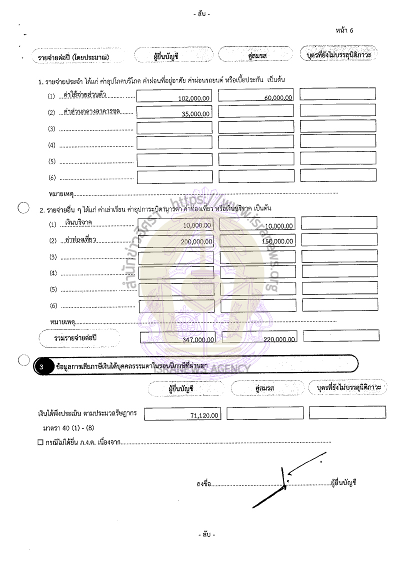 คู่สมรส ไม่แจ้งรายได้ แจ้งมีรายจ่าย 220,000 บาทจากค่าใช้จ่ายส่วนตัว 60,000 บาท เงินบริจาค 10,000 บาท ค่าท่องเที่ยว 150,000 บาท