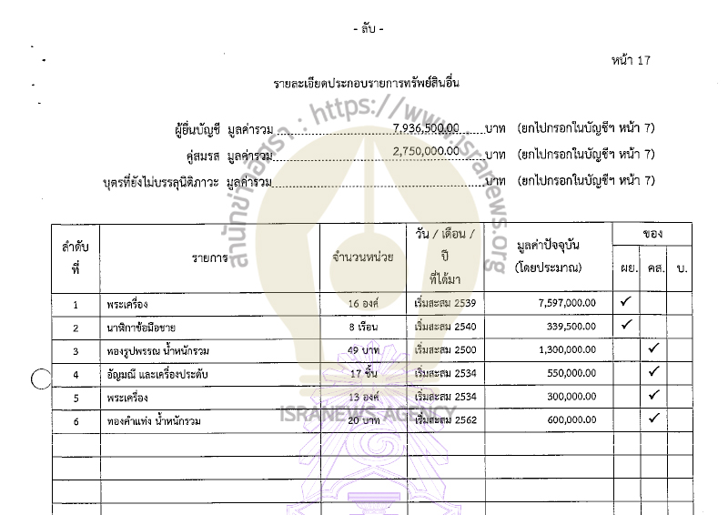คู่สมรส แจ้งมี ทองรูปพรรณ น้ำหนักรวม 49 บาท 1,300,000 บาท อัญมณีและเครื่องประดับ 17 ชิ้น 550,000 บาท พระเครื่อง 13 องค์ เริ่มสะสมตั้งแต่ปี 2534 มูลค่ารวม 300,000 บาท ทองคำแท่ง น้ำหนักรวม 20 บาท 600,000 บาท