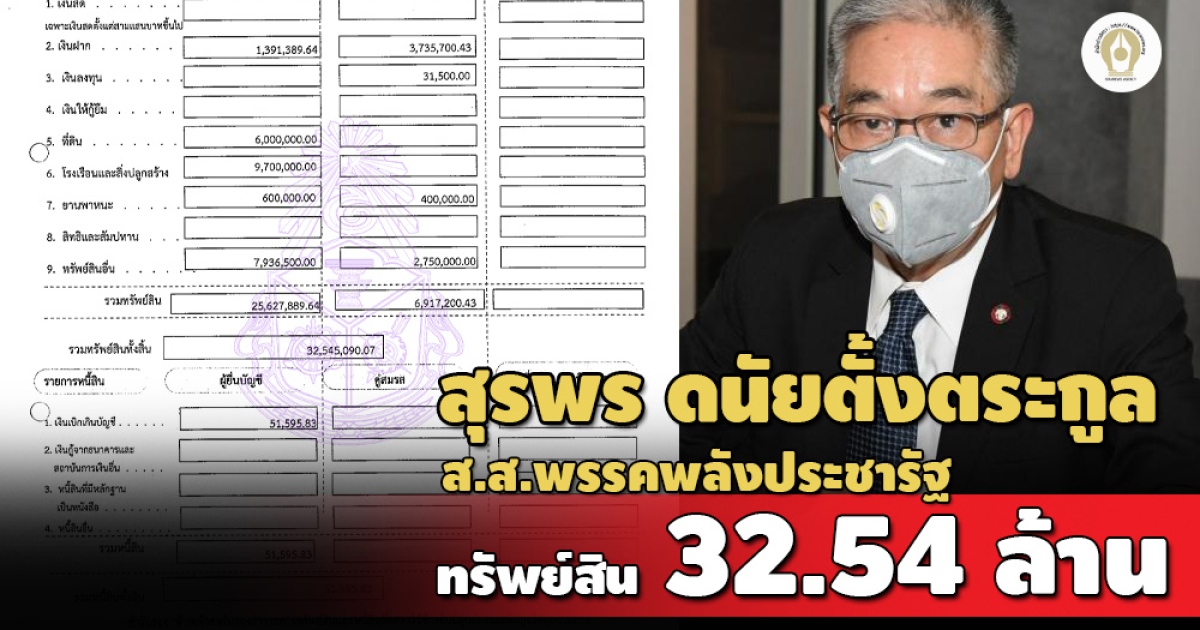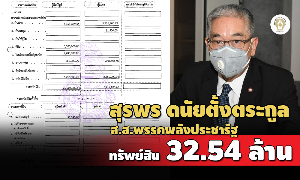 ทรัพย์สิน 32.54 ล้านบาท 'สุรพร ดนัยตั้งตระกูล' ส.ส.ป้ายแดง พรรคพลังประชารัฐ ที่ดิน 10 ไร่ 6 ล้านบาท บ้าน-ห้องชุด 9.7 ล้านบาท สะสมพระเครื่อง 29 องค์ ทองรูปพรรณ หนัก 49 บาท ทองคำแท่ง หนัก 20 บาท