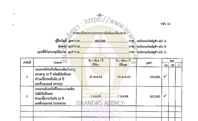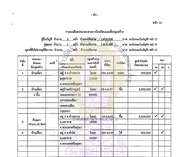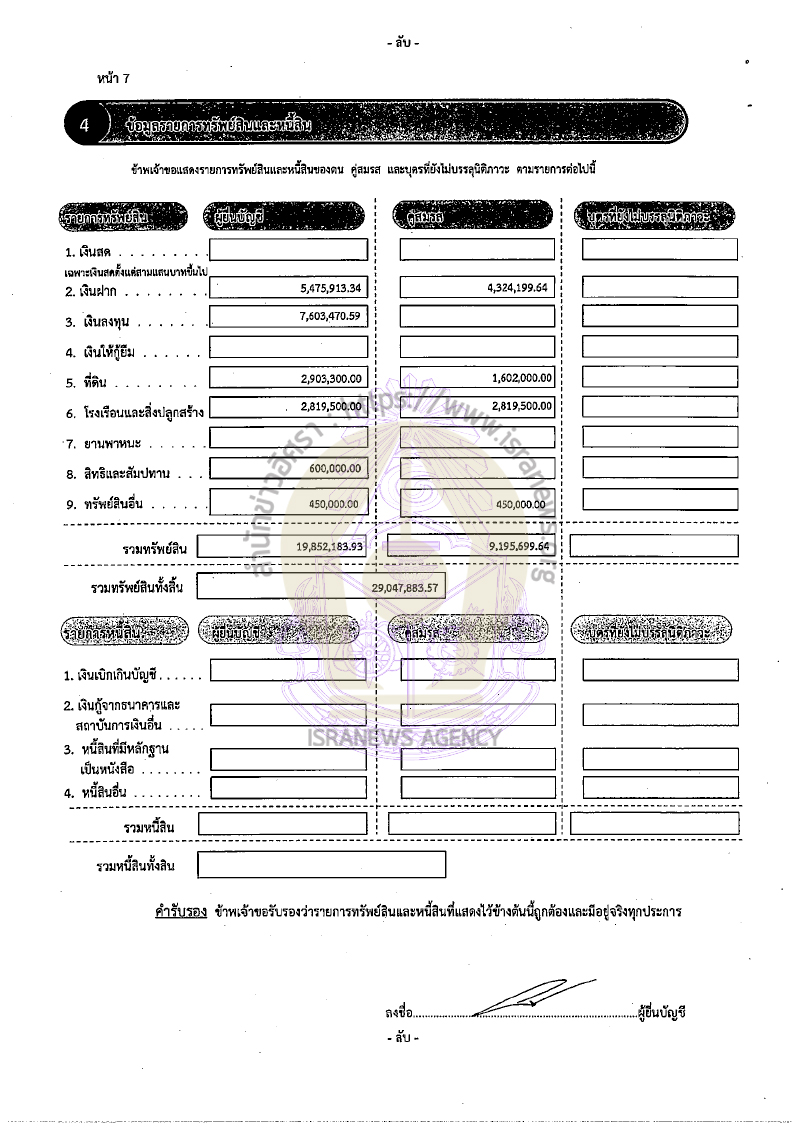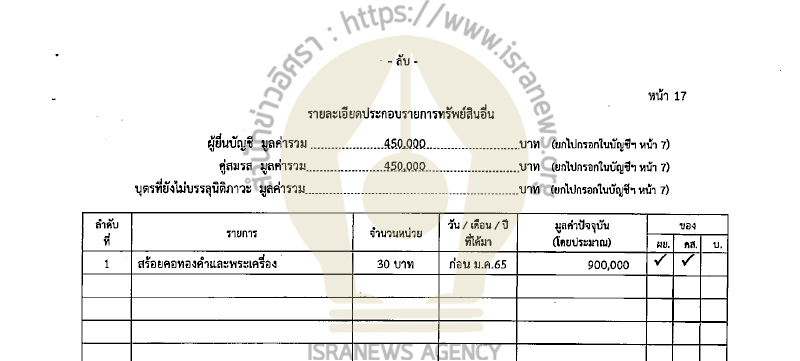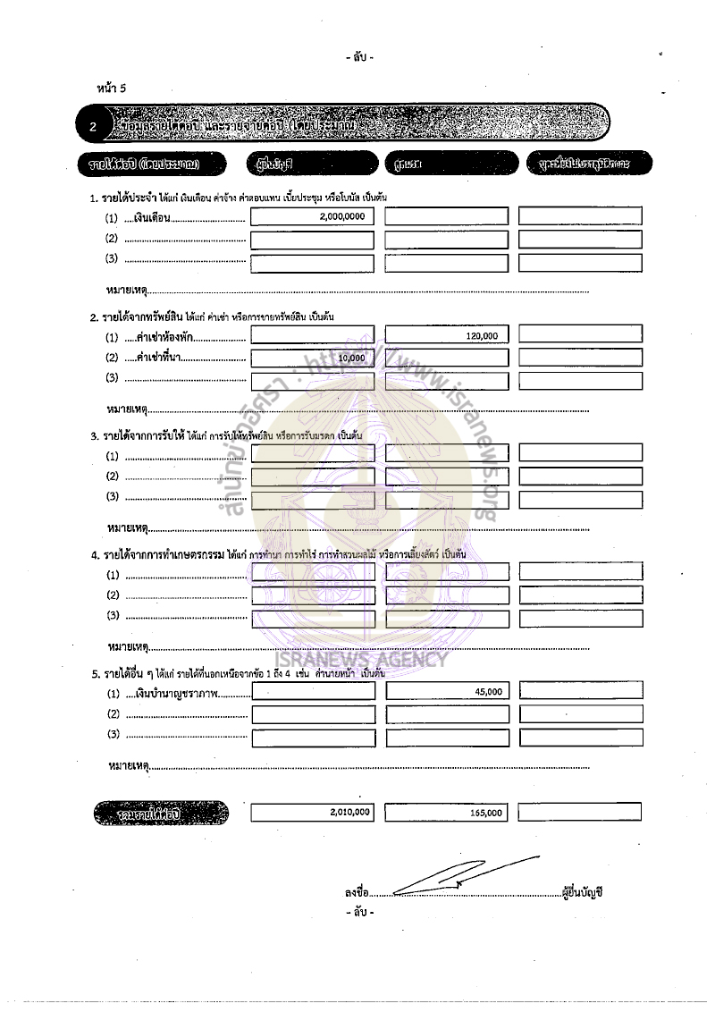 คู่สมรส แจ้งมีรายได้ต่อปี 165,000 บาท จากค่าเช่าห้องพัก 120,000 บาท เงินบำนาญชราภาพ 45,000 บาท แจ้งมีรายจ่าย 120,000 บาทจากค่าอุปโภคบริโภค
