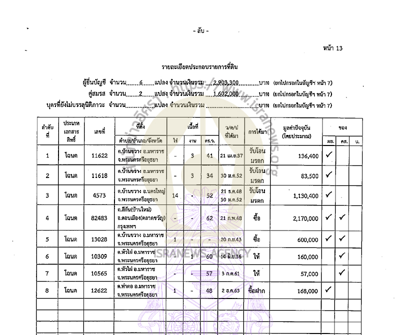 รวมทรัพย์สินทั้งสิ้น 29,047,883.57 บาท (เงินฝาก 16 บัญชี 9,800,112.98 บาท ที่ดิน 8 แปลง 4,505,300 บาท บ้าน 3 หลัง ตึกแถว 1 หลัง 5,639,000 บาท) ไม่มีหนี้สิน