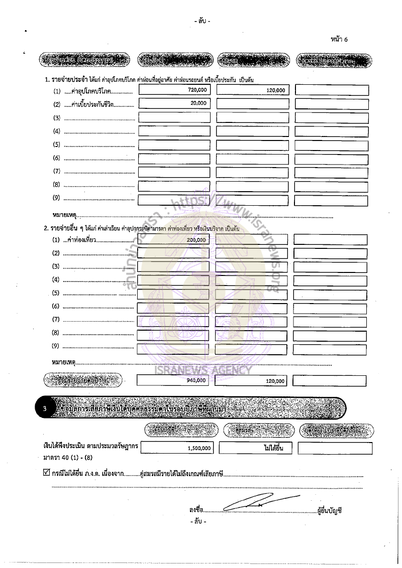 นายวิลาศ แจ้งมีรายได้ต่อปี 2,010,000 บาท จากเงินเดือน 2,000,000 บาท ค่าเช่าที่นา 10,000 บาท แจ้งมีรายจ่าย 940,000 บาท จากค่าอุปโภคบริโภค 720,000 บาท ค่าเบี้ยประกันชีวิต 20,000 บาท ค่าท่องเที่ยว 200,00 บาท