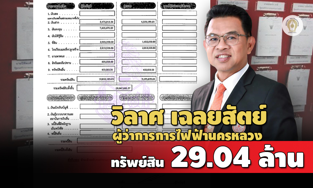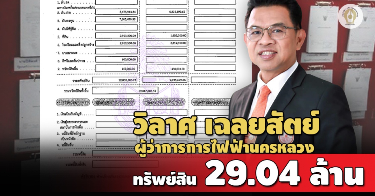 ทรัพย์สิน 29.04 ล้านบาท 'วิลาศ เฉลยสัตย์' ผู้ว่าฯ กฟน. เงินฝาก 9.8 ล้านบาท ที่ดิน 8 แปลง 4.5 ล้านบาท สะสมสร้อยคอทองคำและพระเครื่อง น้ำหนักรวม 30 บาท รายได้ 2.01 ล้านบาท จากเงินเดือน-ค่าเช่าที่นา