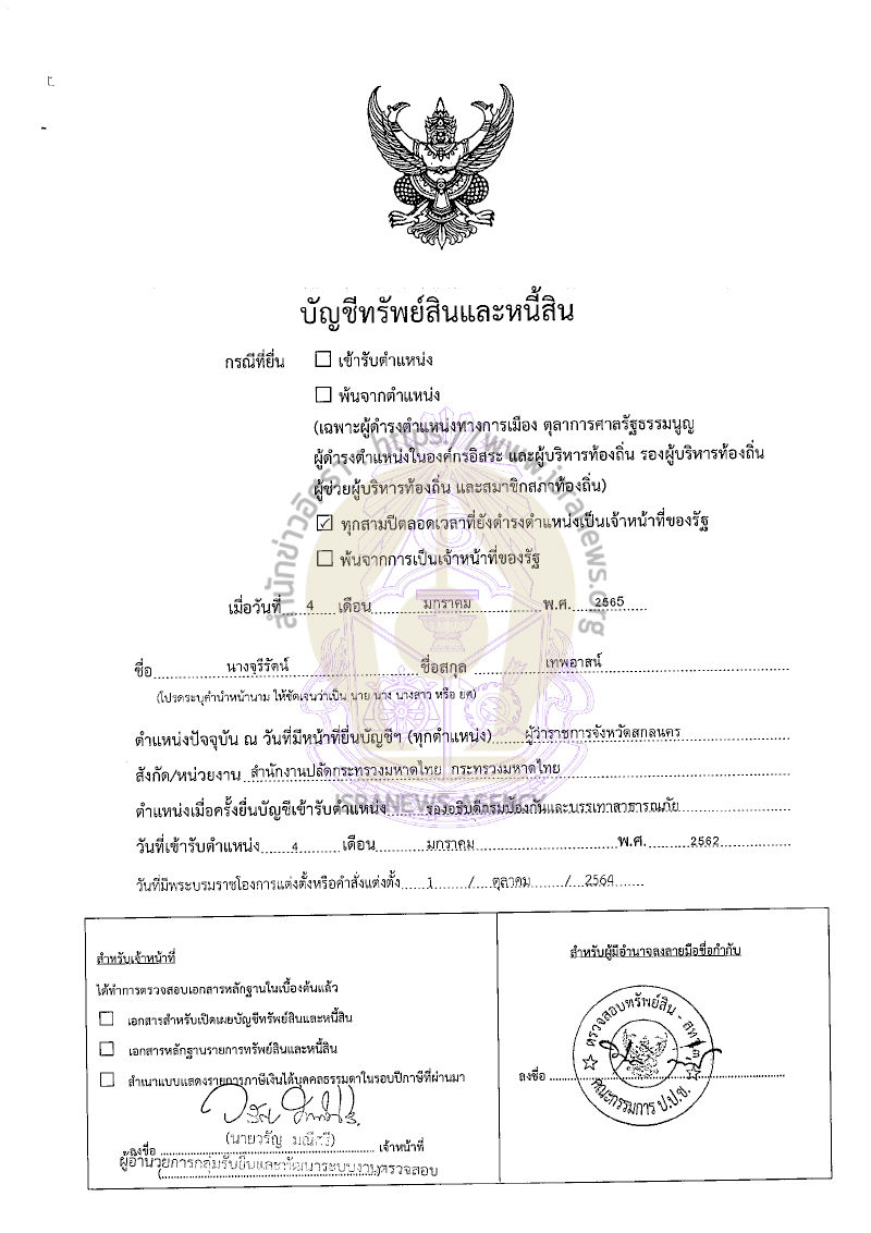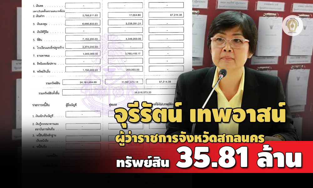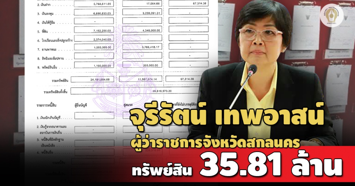 ทรัพย์สิน 35.81 ล้านบาท 'จุรีรัตน์ เทพอาสน์' ผู้ว่าราชการจังหวัดสกลนคร เงินฝาก 15 บัญชี 5,852,990.69 บาท ที่ดิน 8 แปลง 11,498,200 บาท บ้าน 3 หลัง 2,374,040 บาท สามีนักธุรกิจ รายได้ต่อปี 3.31 ล้านบาท
