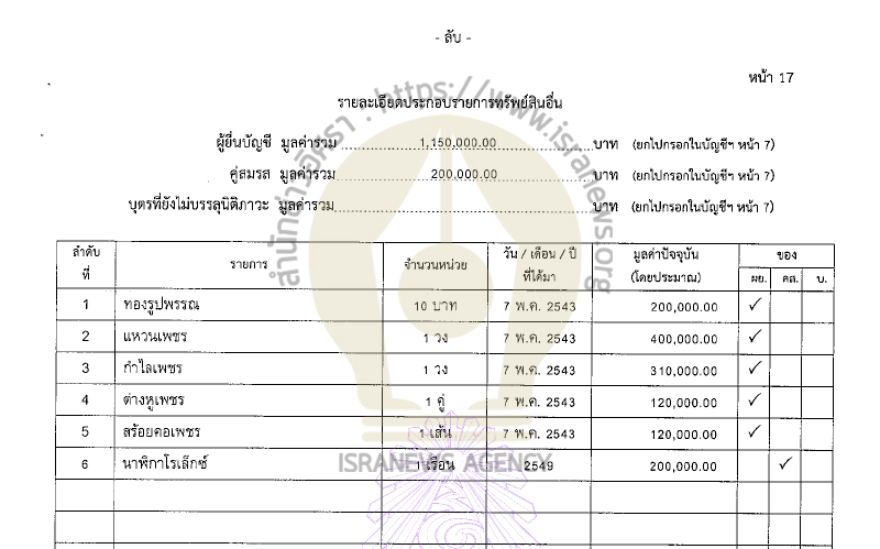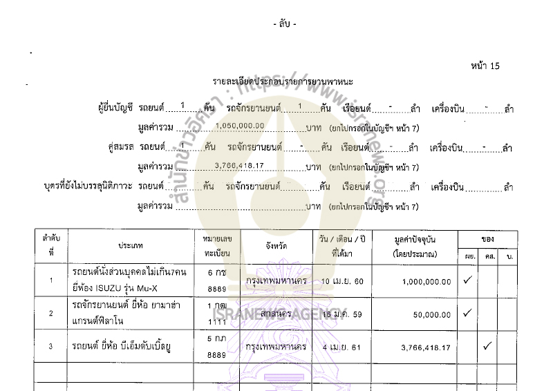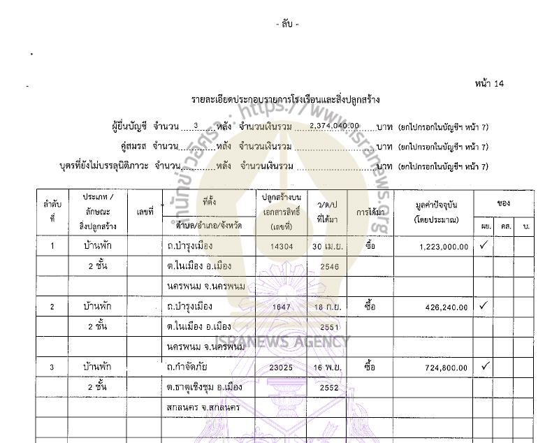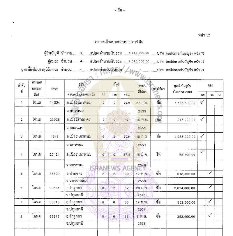 รวมทรัพย์สินทั้งสิ้น 35,816,573.20 บาท (เงินฝาก 15 บัญชี 5,852,990.69 บาท ที่ดิน 8 แปลง 11,498,200 บาท บ้าน 3 หลัง 2,374,040 บาท) หนี้สิน 239,316 บาท