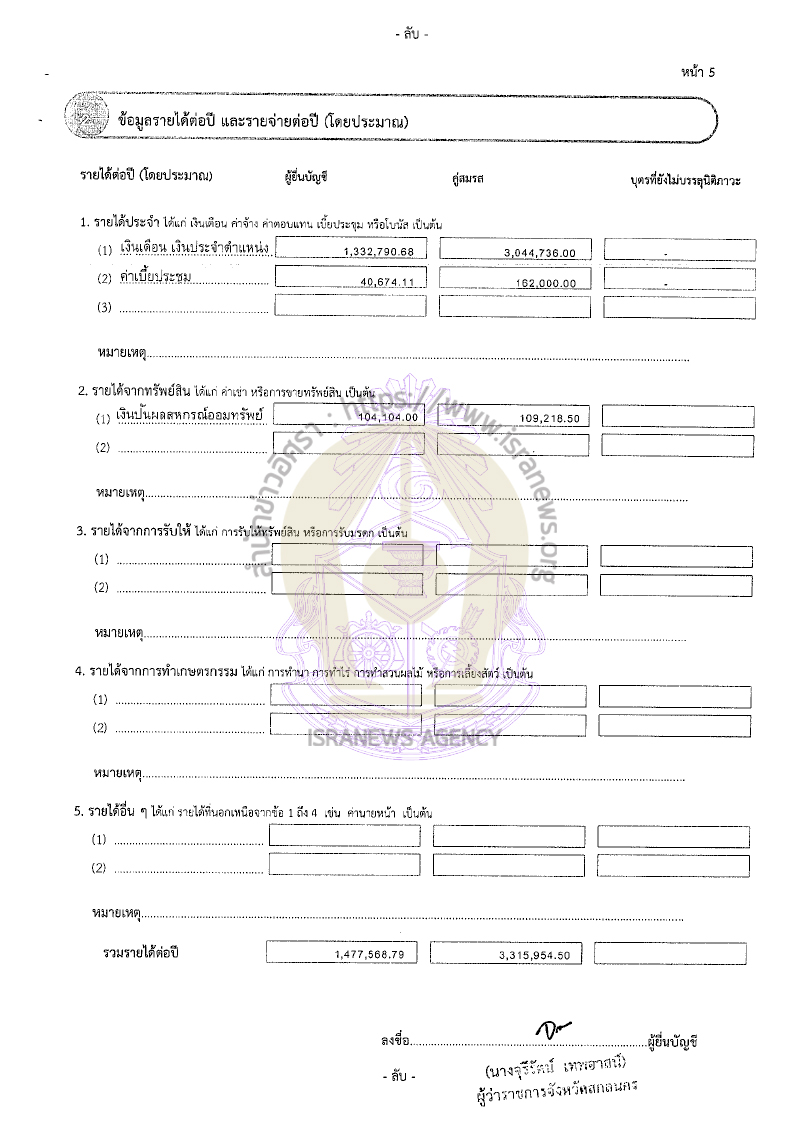 นางจุรีรัตน์ แจ้งมีรายได้ต่อปี 1,477,568.79 บาท จากเงินเดือน เงินประจำตำแหน่ง 1,332,790.68 บาท ค่าเบี้ยประชุม 40,674.11 บาท เงินปันผลสหกรณ์ออมทรัพย์ 104,104 บาท