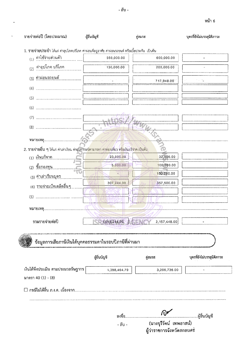 แจ้งมีรายจ่าย 2,157,448 บาท จากค่าใช้จ่ายส่วนตัว 600,000 บาท ค่าอุปโภค บริโภค 200,000 บาท ค่าผ่อนรถยนต์ 717,948 บาท เงินบริจาค 32,000 บาท ซื้อกองทุน 100,000 บาท ค่าเล่าเรียนบุตร 150,000 บาท รายจ่ายเบ็ดเตล็ดอื่นๆ 357,500 บาท
