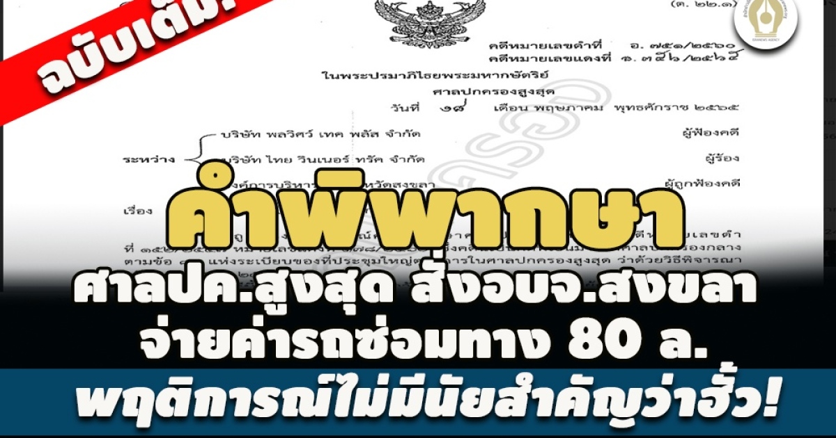 ให้องค์การบริหารส่วนจังหวัด (อบจ.) สงขลา ชำระหนี้ค่ารถซ่อมบำรุงทางเอนกประสงค์ 2 คัน ให้แก่บริษัท พลวิศว์ เทคพลัส จำกัด ผู้ฟ้อง เป็นจำนวนเงินรวมดอกเบี้ยกว่า 80 ล้านบาท รวมดอกเบี้ย