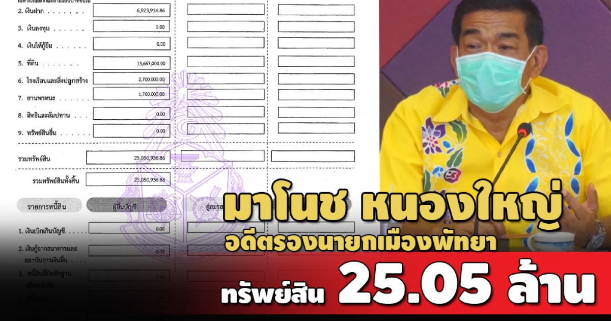 ทรัพย์สิน 25.05 ล้านบาท 'มาโนช หนองใหญ่' พ้นรองนายกเมืองพัทยา เงินฝาก 2 บัญชี 6.92 ล้านบาท ที่ดิน 3 แปลง 13.66 ล้านบาท