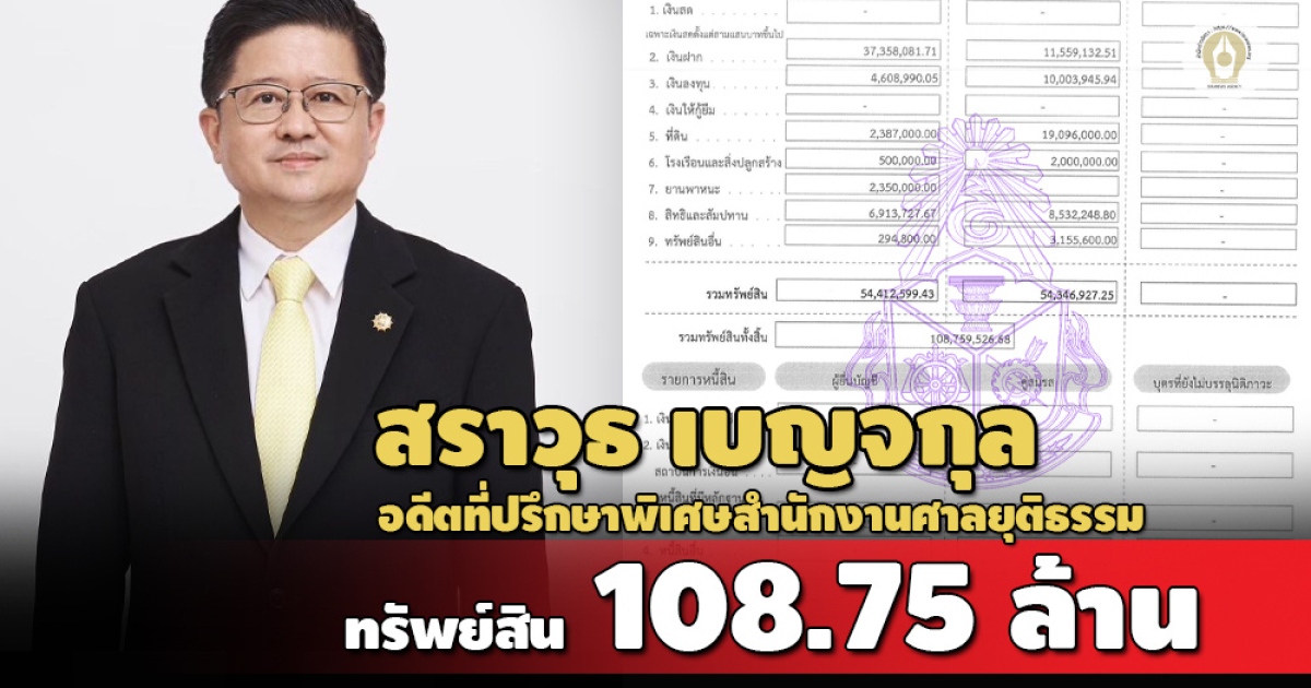 ทรัพย์สิน 108.75 ล้านบาท 'สราวุธ เบญจกุล' อดีตที่ปรึกษาพิเศษสำนักงานศาลยุติธรรม กรณีพ้นประธานบอร์ด ทอท. - คู่สมรส มีเงินฝาก 32 บัญชี 48.91 ล้านบาท เงินลงทุน 16 รายการ 14.61 ล้านบาท ที่ดิน 11 แปลงที่ กทม.-เชียงใหม่-ตรัง 21.48 ล้านบาท