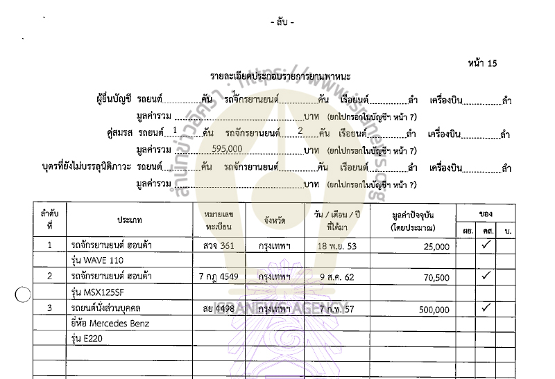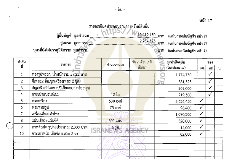 คู่สมรส แจ้งครอบครอง ทองรูปพรรณ น้ำหนักรวม 57.25 บาท รวม 1,774,750 บาท จี้เพชร 2 ชิ้น ชุดเครื่องเพชร 2 ชุด 581,323 บาท อัญมณี (กำไลหยก , ปี่เซี้ยหยก , สร้อยมุก) 209,000 บาท กระเป๋าแบรนด์เนม 12 ใบ 219,300 บาท