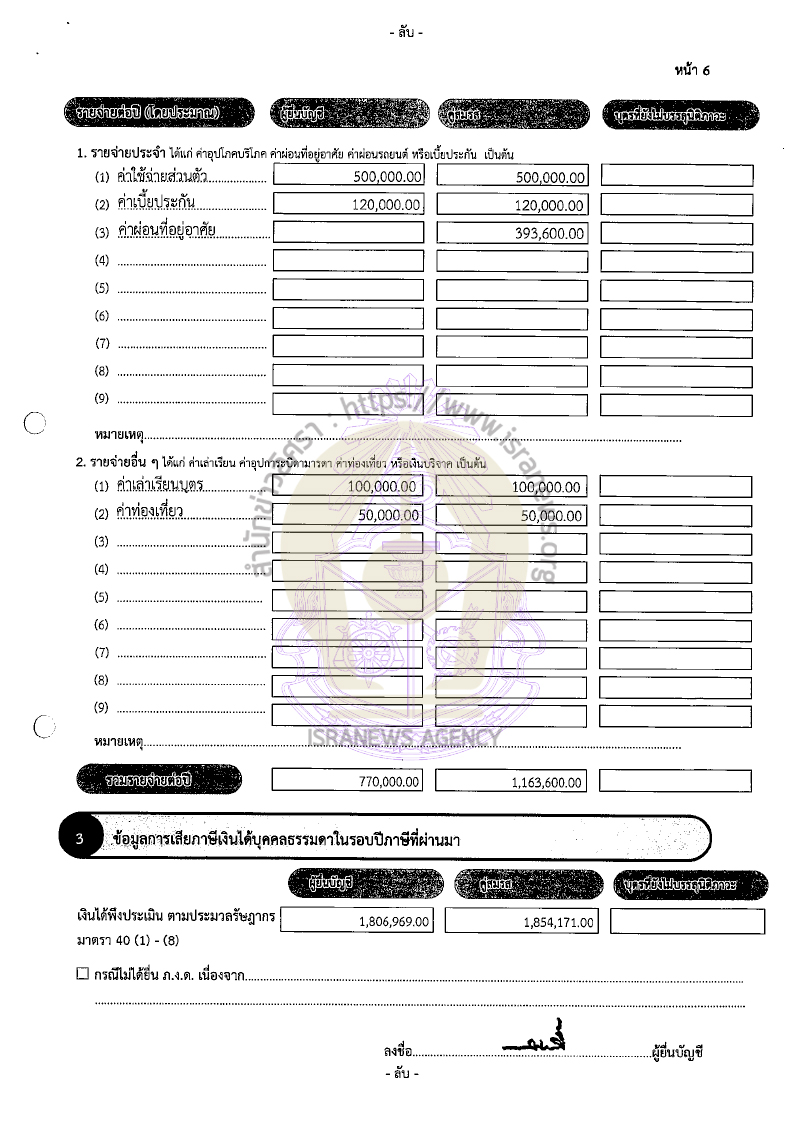 แจ้งมีรายจ่าย 770,000 บาท จากค่าใช้จ่ายส่วนตัว 500,000 บาท ค่าเบี้ยประกัน 120,000 บาท ค่าเล่าเรียนบุตร 100,000 บาท ค่าท่องเที่ยว 50,000 บาท