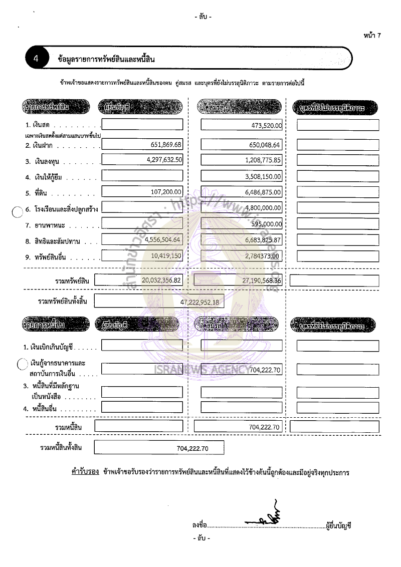 รวมทรัพย์สินทั้งสิ้น 47,222,952.18 บาท หนี้สิน 704,222.70 บาท
