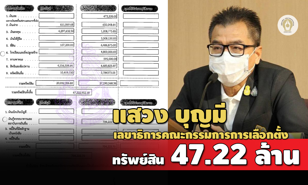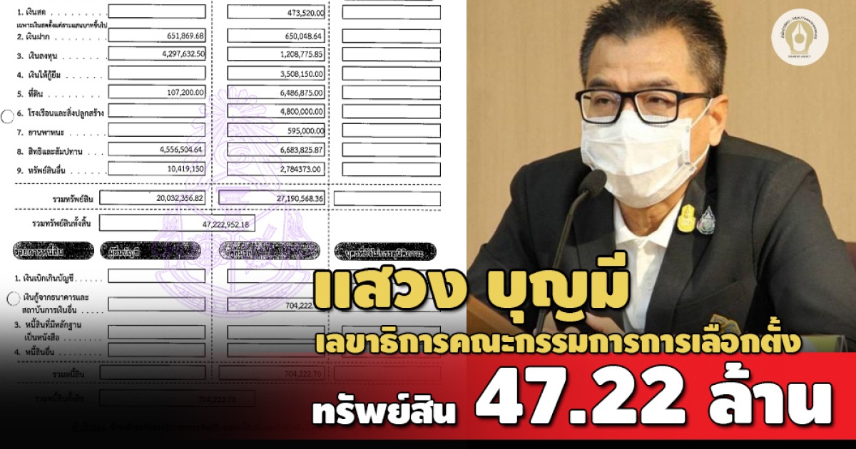 ทรัพย์สิน 47.22 ล้านบาท 'แสวง บุญมี' นั่งเลขาฯ กกต. เงินฝาก 12 บัญชี 1.30 ล้านบาท เงินลงทุน 16 รายการ 5.50 ล้านบาท ที่ดิน 6 แปลง 6.59 ล้านบนาท บ้าน 4 หลัง 4.80 ล้านบาท สะสมพระเครื่อง 530 องค์ พระพุทธรูป 73 องค์ แผ่นเสียง-ซีดี 800 แผ่น