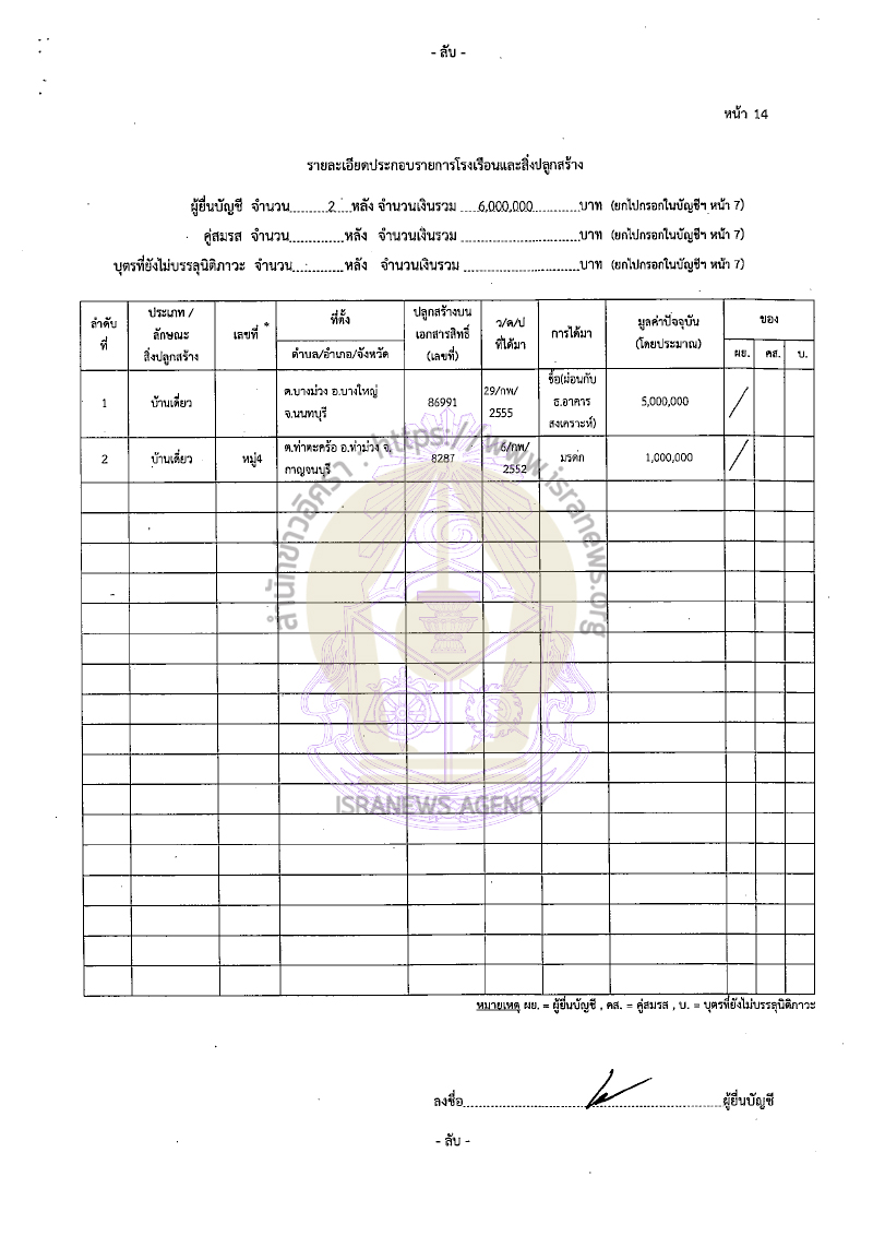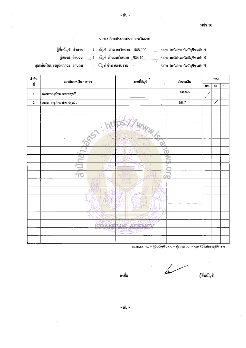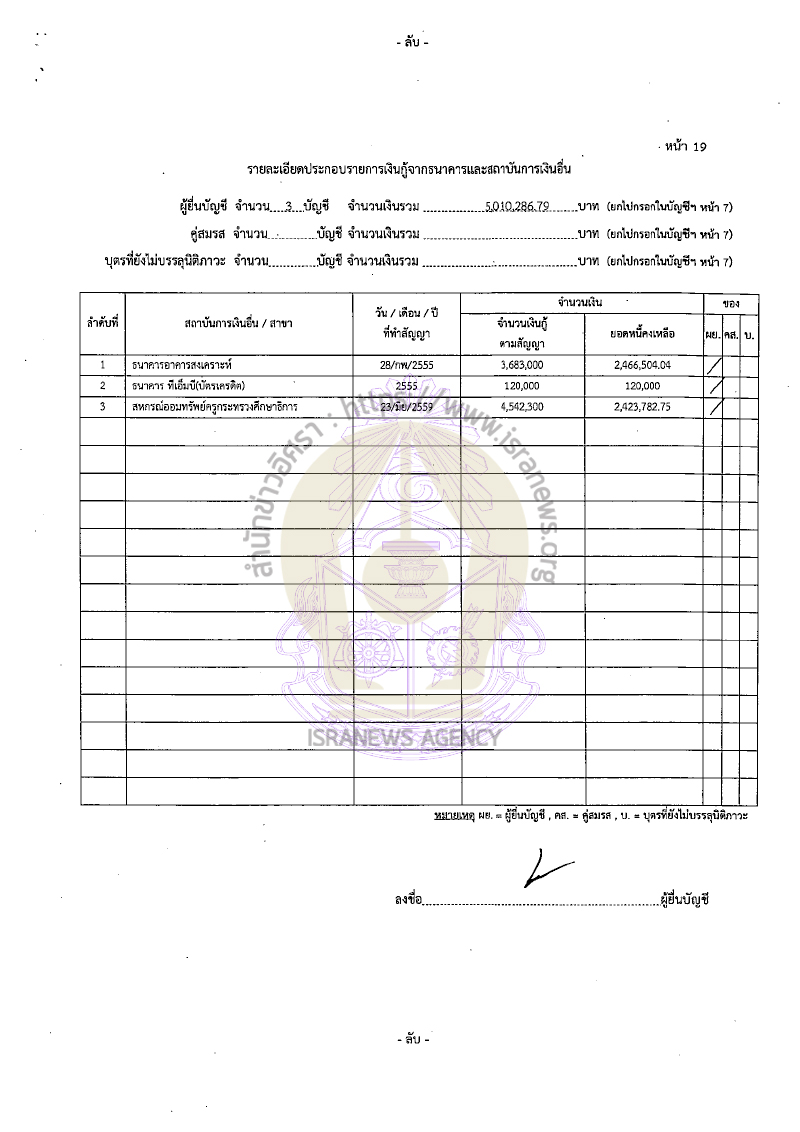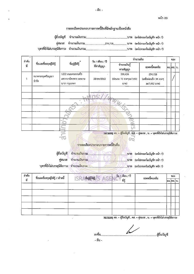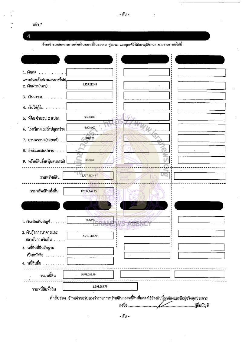 มีหนี้สิน 5,598,285.79 บาท จากเงินเบิกเกินบัญชี 588,000 บาท เงินกู้ธนาคาร 5,010,286.79 บาท