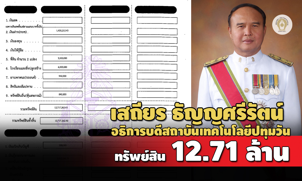 ทรัพย์สิน 12.71 ล้านบาท 'เสถียร ธัญญศรีรัตน์'นั่งอธิการบดีสถาบันเทคโนโลยีปทุมวัน ที่ดิน 2 แปลง บ้าน 2 หลัง รวม 9.5 ล้านบาท รายได้ต่อปี 1.83 ล้านบาทจากเงินเดือน เงินประจำตำแหน่ง ค่าสอน เบี้ยประชุม