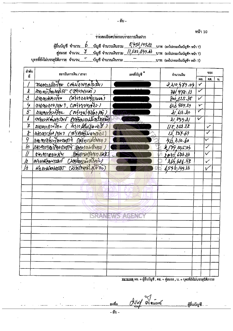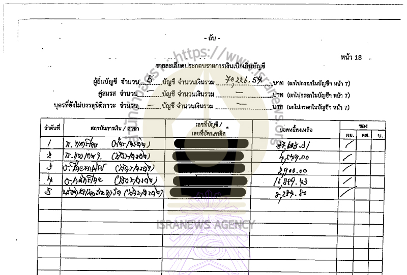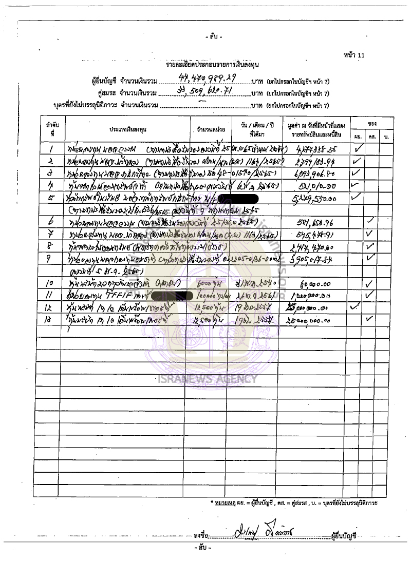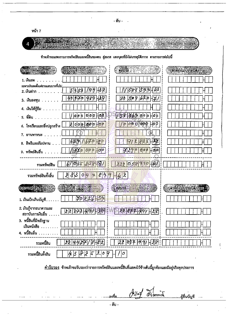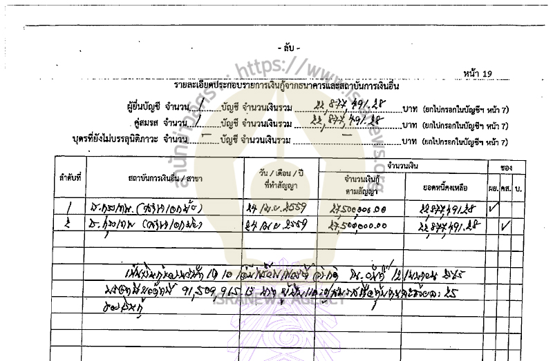แจ้งมีหนี้สิน 22,947,717.82 บาท จากเงินเบิกเกินบัญชี 70,226.54 บาท เงินกู้ธนาคาร 22,877,491.28 บาท