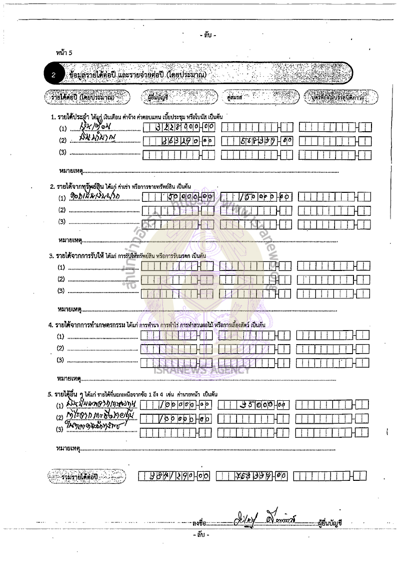คู่สมรส แจ้งมีรายได้ต่อปี 753,337 บาท จากเงินบำนาญ 568,339 บาท ดอกเบี้ยเงินฝาก 150,000 บาท เงินปันผลจากการลงทุน 350,000 บาท