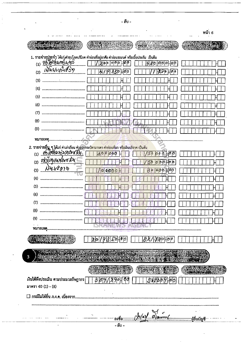 แจ้งมีรายจ่าย 821,780 บาท จากค่าใช้จ่ายส่วนตัว 480,000 บาท เบี้ยประกันชีวิต 11,780 บาท ค่าใช้จ่ายทรัพย์สินอื่น 150,000 บาท ค่าจ้างดูแลทรัพย์สิน 150,000 บาท เงินบริจาค 30,000 บาท